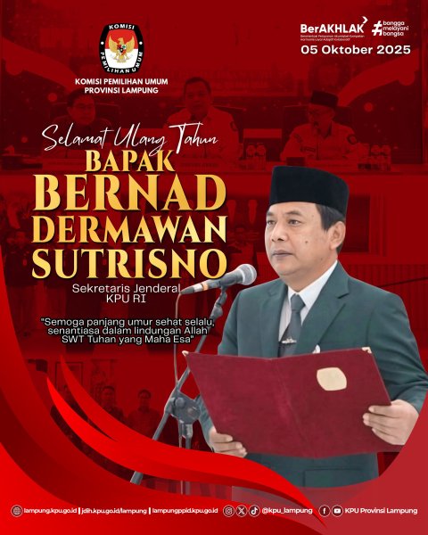#TemanPemilih, KPU Provinsi Lampung mengucapkan Selamat Ulang Tahun Bapak Bernad Dermawan Sutrisno, Sekretaris Jenderal KPU Republik Indonesia. Semoga senantiasa diberikan kesehatan, keberkahan, dan selalu berada dalam lindungan Allah SWT. #KPULampung #KPUMelayani ....