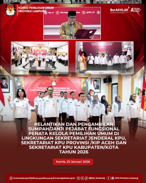 #TemanPemilih, Sekretariat KPU Provinsi Lampung mengikuti kegiatan Pelantikan dan Pengambilan Sumpah/Janji Pejabat Fungsional Penata Kelola Pemilihan Umum di lingkungan Sekretariat Jenderal KPU, Sekretariat KPU Provinsi/KIP Aceh, serta Sekretariat KPU/KIP Kabupaten/Kota Tahun 2026 yang dilaksanakan secara daring, Kamis (22/1/2026). Dalam kegiatan tersebut, sebanyak 19 orang pejabat fungsional di lingkungan Sekretariat KPU Provinsi Lampung resmi dilantik. Pelantikan ini dihadiri oleh Sekretaris KPU Provinsi Lampung Arif Ma’ruf, jajaran Kepala Bagian, jajaran Kepala Subbagian, serta pejabat fungsional. Kegiatan pelantikan dan pengambilan sumpah/janji dipimpin langsung oleh Sekretaris Jenderal KPU RI, Bernad Dermawan Sutrisno, serta diikuti oleh jajaran KPU Provinsi dan KPU/KIP Kabupaten/Kota dari seluruh Indonesia. Dalam sambutannya, Sekretaris Jenderal KPU RI, Bernad Dermawan Sutrisno menegaskan bahwa jabatan fungsional merupakan jabatan yang memiliki peran dan tanggung jawab strategis, tidak hanya sebagai pelengkap jabatan struktural, tetapi sebagai bagian penting dalam mendukung kinerja kelembagaan KPU. Oleh karena itu, para pejabat fungsional diharapkan mampu mengemban amanah jabatan secara profesional, bertanggung jawab, serta menjunjung tinggi etos kerja, dedikasi, dan integritas. Sementara itu, Ketua KPU RI, Mochammad Afifuddin menyampaikan bahwa pelantikan Pejabat Fungsional Penata Kelola Pemilihan Umum ini merupakan salah satu bentuk penyempurnaan sistem manajemen sumber daya manusia. Dengan dilaksanakannya pelantikan ini, pimpinan berharap para pejabat yang dilantik semakin bersemangat dalam menjalankan tugas dan tanggung jawab keseharian. Selain itu, pelantikan ini diharapkan dapat menjadi awal yang baik bagi pengembangan karier aparatur di lingkungan KPU. #KPULampung #InfoKPU #KPUMelayani ....
