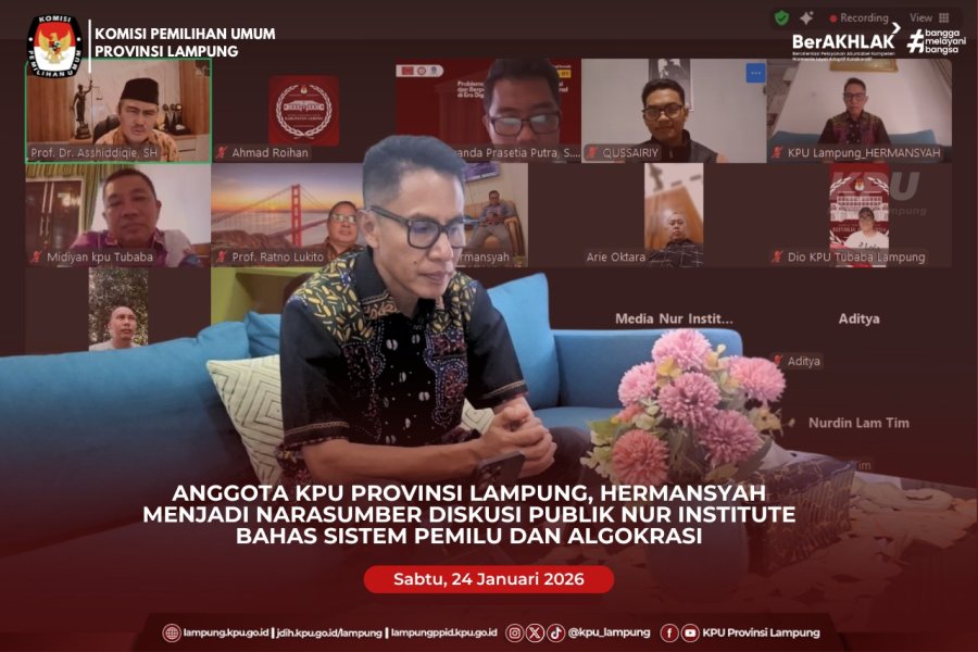 #TemanPemilih, Anggota KPU Provinsi Lampung, Hermansyah, S.H., M.H., menjadi narasumber dalam Diskusi Publik NUR Institute bertema “Kedaulatan Rakyat di Era Algocracy: Menakar Sistem Pemilu Proporsional Terbuka dan Tertutup” yang dilaksanakan pada Sabtu, 24 Januari 2026. Kegiatan ini diikuti oleh mahasiswa, akademisi, dan pemerhati kepemiluan dari berbagai daerah. Diskusi diawali dengan opening speech Prof. Dr. Jimly Asshiddiqie, S.H., M.H. (Ketua MK RI 2003–2008), serta menghadirkan Prof. Drs. H. Ratno Lukito, M.A., DCL dan Prof. Dr. Drs. Yusdani, M.Ag sebagai narasumber. Kegiatan dipandu oleh Qusairi (mahasiswa UIN) dan dibuka dengan sambutan Mutiara Rambe selaku Direktur Riset NUR Institute. Dalam pemaparannya, Hermansyah menyoroti tantangan strategis dan teknis penyelenggaraan pemilu, termasuk Putusan MK Nomor 135, perdebatan sistem proporsional, netralitas ASN, TNI, dan Polri, politik uang, disinformasi, serta persoalan data pemilih dan distribusi logistik. Terkait algokrasi, ia menegaskan bahwa algoritma dapat meningkatkan efisiensi pengelolaan data, namun tidak dapat menggantikan proses pencoblosan yang menjadi inti kedaulatan rakyat. Diskusi ini menegaskan pentingnya dialog publik sebagai bentuk pengawalan partisipatif terhadap kebijakan pemilu serta upaya memperkuat pemahaman generasi muda tentang tantangan demokrasi di era teknologi. #KPULampung #KPUMelayani ....