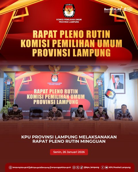 #temanpemilih, (Senin, 26 Januari 2026) KPU Provinsi Lampung melaksanakan Rapat Pleno Rutin Mingguan bertempat di Aula Kantor KPU Provinsi Lampung. Rapat Pleno dikuti Ketua KPU Provinsi Lampung Erwan Bustami, Anggota KPU Provinsi Lampung Ahmad Zamroni, Hermansyah, Angga Lazuardy dan Dedi Fernando serta Febri indra Kurniawan, Ervhan Jaya, yang mengikuti secara daring, kemudian Kabag, Pejabat Fungsional, dan Kasubbag di Lingkungan KPU Provinsi Lampung. Dalam rapat pleno dibahas antara lain Tindak Lanjut Instruksi Gubernur Lampung nomor 4 tahun 2025, menjaga kearifan lokal dengan program Kamis Beradab untuk menggunakan bahasa daerah dan batik daerah Lampung dalam aktifitas perkantoran. #KPULAMPUNG #KPUMELAYANI ....
