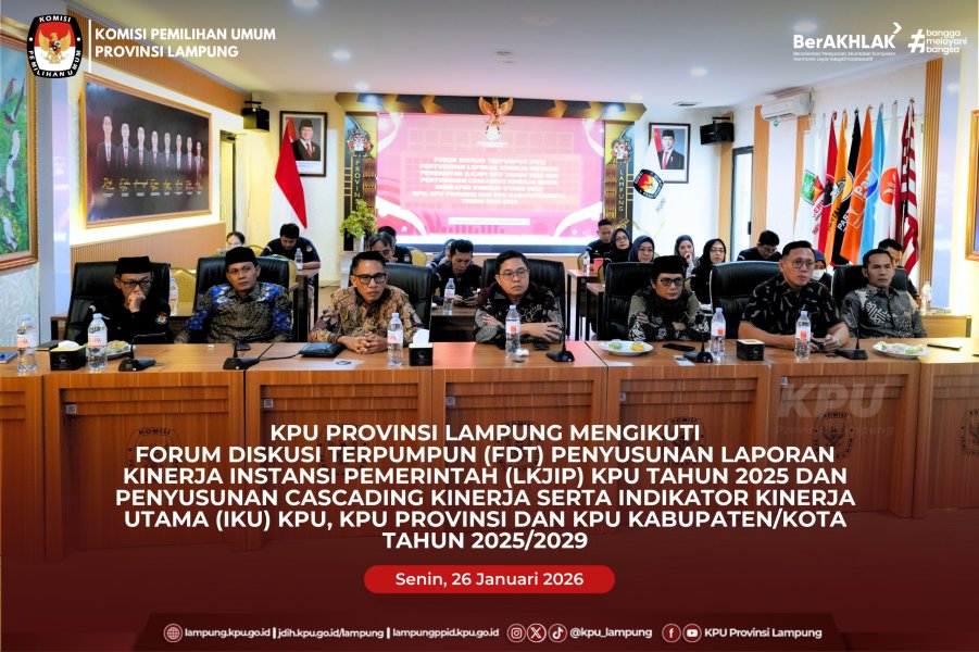 #TemanPemilih, KPU Provinsi Lampung mengikuti Forum Diskusi Terpumpun (FDT) Penyusunan Laporan Kinerja Instansi Pemerintah (LKjIP) KPU Tahun 2025 dan Penyusunan Cascading Kinerja serta Indikator Kinerja Utama (IKU) KPU, KPU Provinsi, dan KPU Kabupaten/Kota Tahun 2025–2029 secara daring melalui Zoom Meeting, Selasa (27/1/2026). Kegiatan tersebut dilaksanakan dari Aula Kantor KPU Provinsi Lampung. Kegiatan ini diikuti oleh Ketua KPU Provinsi Lampung Erwan Bustami, bersama para Anggota KPU Provinsi Lampung yaitu Hermansyah, Ahmad Zamroni, Dedi Fernando, Ervhan Jaya, Febri Indra Kurniawan, dan Angga Lazuardy serta Sekretaris KPU Provinsi Lampung Arif Ma’ruf. Turut hadir pula jajaran Kepala Bagian, Kepala Subbagian, dan Pejabat Fungsional di lingkungan KPU Provinsi Lampung. Forum diskusi ini menghadirkan narasumber dari Kementerian PPN/Bappenas yang membahas penyelarasan perencanaan kinerja KPU dengan rencana pembangunan nasional, cascading kinerja yang akurat, serta evaluasi RKP KPU Tahun 2025. Selain itu, narasumber dari Kementerian PANRB menyampaikan materi terkait Sistem Akuntabilitas Kinerja Instansi Pemerintah (SAKIP), mulai dari perencanaan, pengukuran, pelaporan, hingga evaluasi kinerja dan analisis capaian serta realisasi anggaran. Kegiatan ini ditutup oleh Anggota KPU RI, Iffa Rosita, yang berharap forum diskusi mampu memberikan pemahaman dan tafsir yang sama terkait Rencana Strategis KPU Tahun 2025–2029. Ia menegaskan bahwa penyusunan dokumen kinerja ini harus menjadi evaluasi awal sebelum memasuki pelaksanaan program dan kegiatan pada periode 2026 hingga 2029. Iffa juga menekankan pentingnya keselarasan penyusunan cascading kinerja antara KPU RI, KPU Provinsi, dan KPU Kabupaten/Kota, serta mengingatkan agar rumusan Indikator Kinerja Utama (IKU) disusun secara relevan, realistis, dan dapat dilaksanakan. #KPUMelayani #KPULampung ....