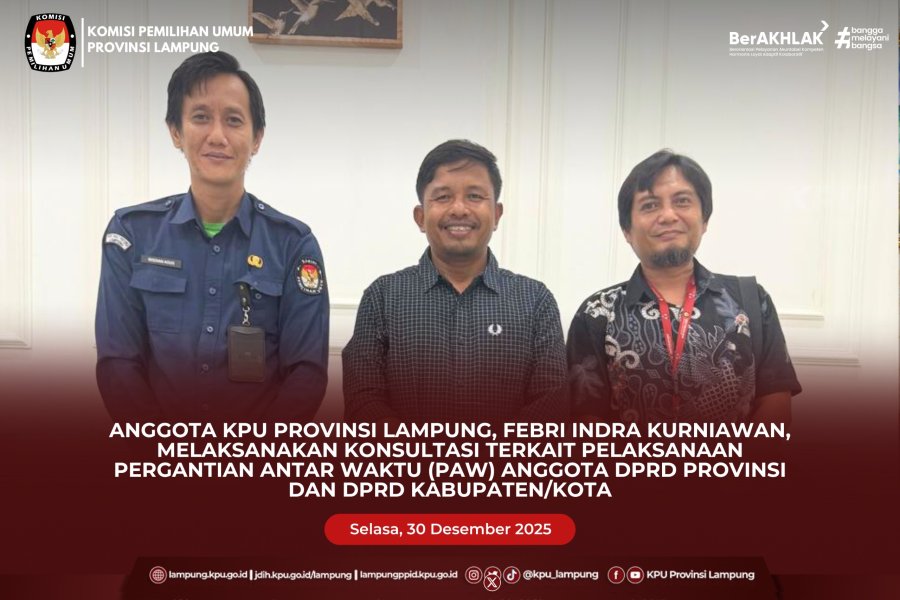 Anggota KPU Provinsi Lampung, Febri Indra Kurniawan, melaksanakan konsultasi terkait pelaksanaan Pergantian Antar Waktu (PAW) Anggota DPRD Provinsi dan DPRD Kabupaten/Kota di KPU RI, Selasa (30/12/2025).