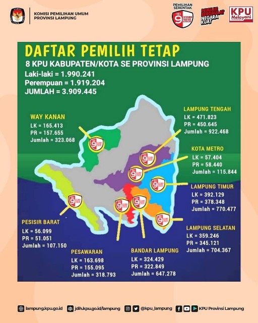 8. DPT Lampung Selatan yaitu 704.367 pemilih, terdiri dari pemilih Laki-laki = 359.246 dan pemilih perempuan = 345.121 yang tertuang dalam Berita Acara Nomor : 79/PL.02.1-BA/1801/KPU-Kot/X/2020 tertanggal 16 Oktober 2020.