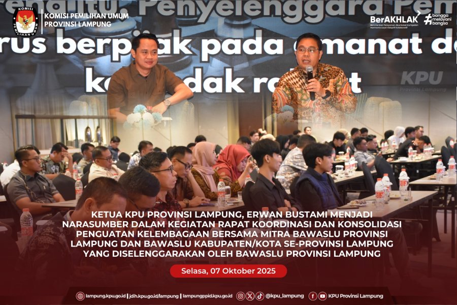 Ketua KPU Provinsi Lampung, Erwan Bustami menjadi narasumber dalam kegiatan Rapat Koordinasi dan Konsolidasi Penguatan Kelembagaan Bersama Mitra Bawaslu Provinsi Lampung dan Bawaslu Kabupaten/Kota se-Provinsi Lampung yang diselenggarakan oleh Bawaslu Provinsi Lampung, Selasa (07/10/2025).
