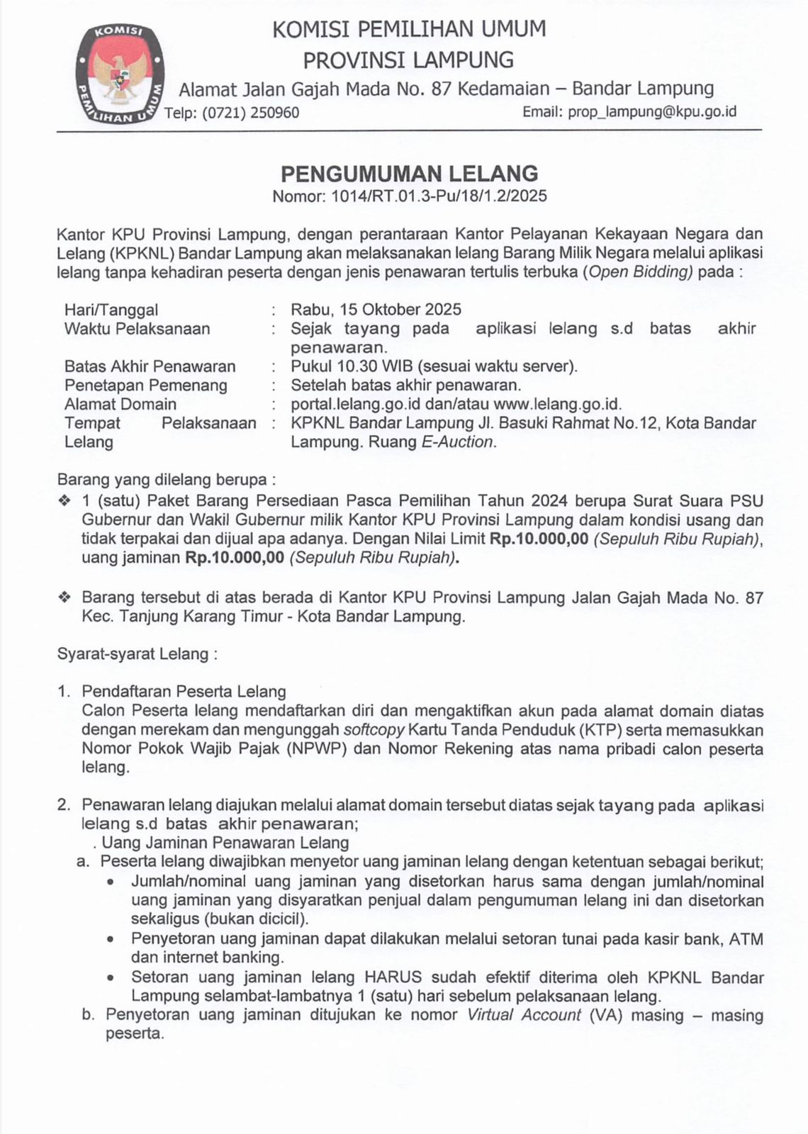KPU Provinsi Lampung menyampaikan pengumuman Lelang Barang Milik Negara (BMN) melalui Aplikasi Lelang tanpa kehadiran peserta dengan jenis penawaran tertulis terbuka (Open Bidding) dengan perantaraan Kantor Pelayanan Kekayaan Negara dan Lelang (KPKNL) Bandar Lampung, pada :