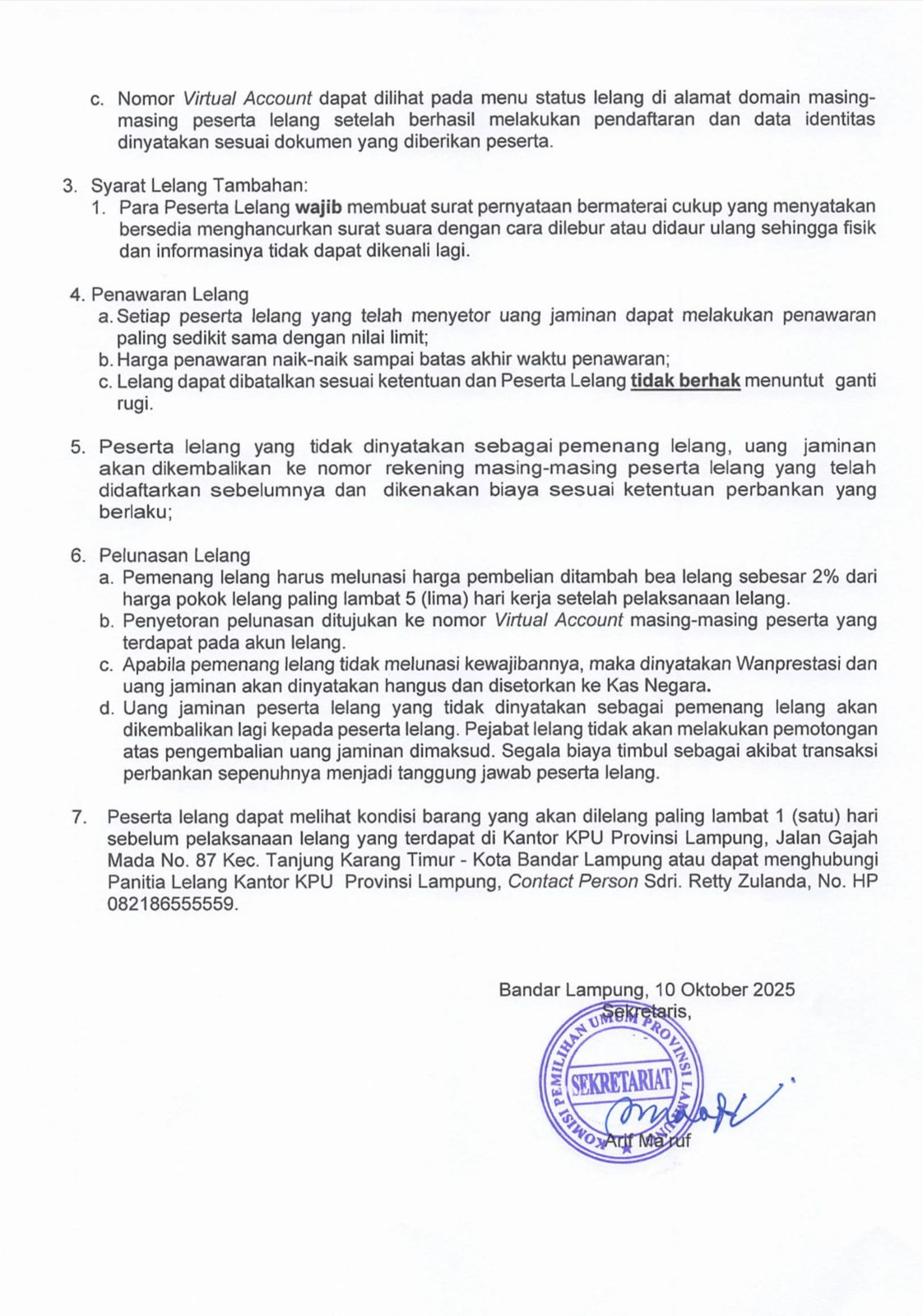 7. Peserta lelang dapat melihat kondisi barang yang akan dilelang paling lambat 1 (satu) hari sebelum pelaksanaan lelang yang terdapat di Kantor KPU Provinsi Lampung, Jalan Gajah Mada No. 87 Kec. Tanjung Karang Timur - Kota Bandar Lampung atau dapat menghubungi Panitia Lelang Kantor KPU Provinsi Lampung, Contact Person Sdri. Retty Zulanda, No. HP 082186555559.