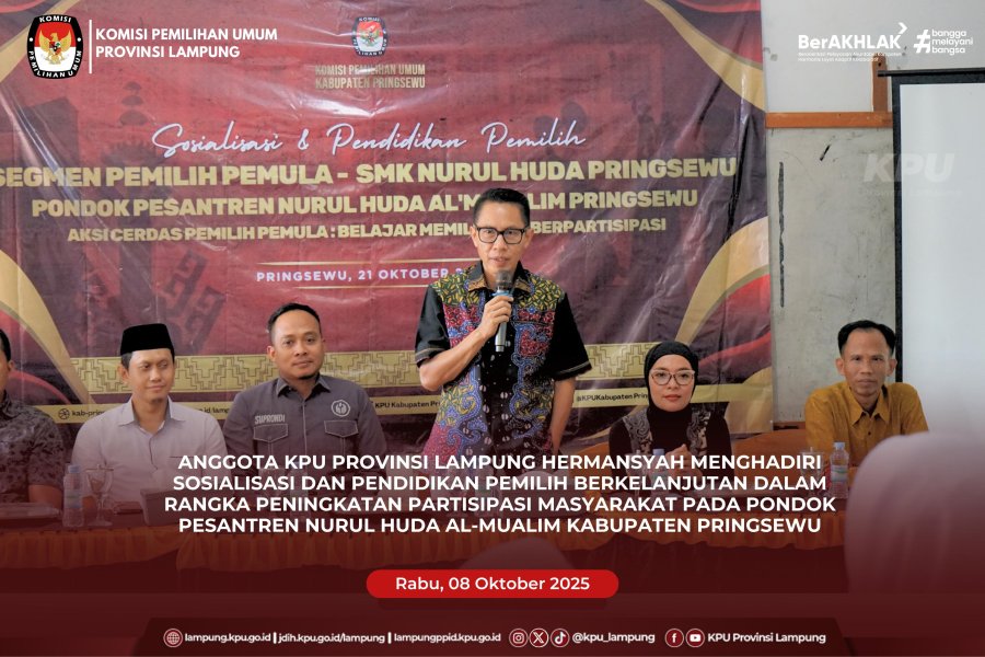 Anggota KPU Provinsi Lampung, Hermansyah, menghadiri kegiatan Sosialisasi Pendidikan Pemilih Segmen Pemilih Pemula yang diselenggarakan oleh KPU Provinsi Lampung bekerja sama dengan KPU Kabupaten Pringsewu di Pondok Pesantren Nurul Huda Al-Mualim, Selasa (21/10/2025).