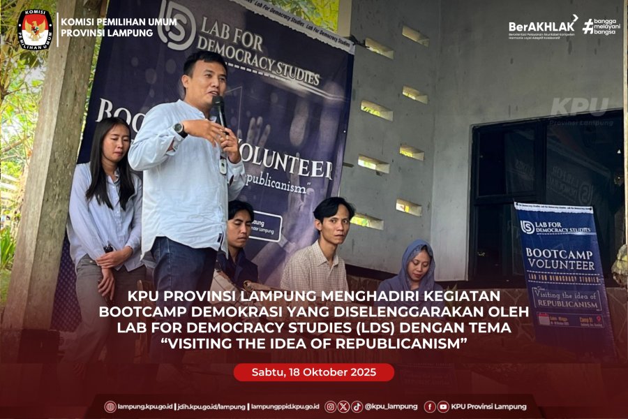 #TemanPemilih — KPU Provinsi Lampung melalui Kepala Subbagian Partisipasi dan Hubungan Masyarakat, Mohd Ade Candra, hadir dalam kegiatan Bootcamp Demokrasi yang diselenggarakan oleh Lab for Democracy Studies (LDS) dengan tema “Visiting The Idea of Republicanism.” Sabtu, 18 Oktober 2025.