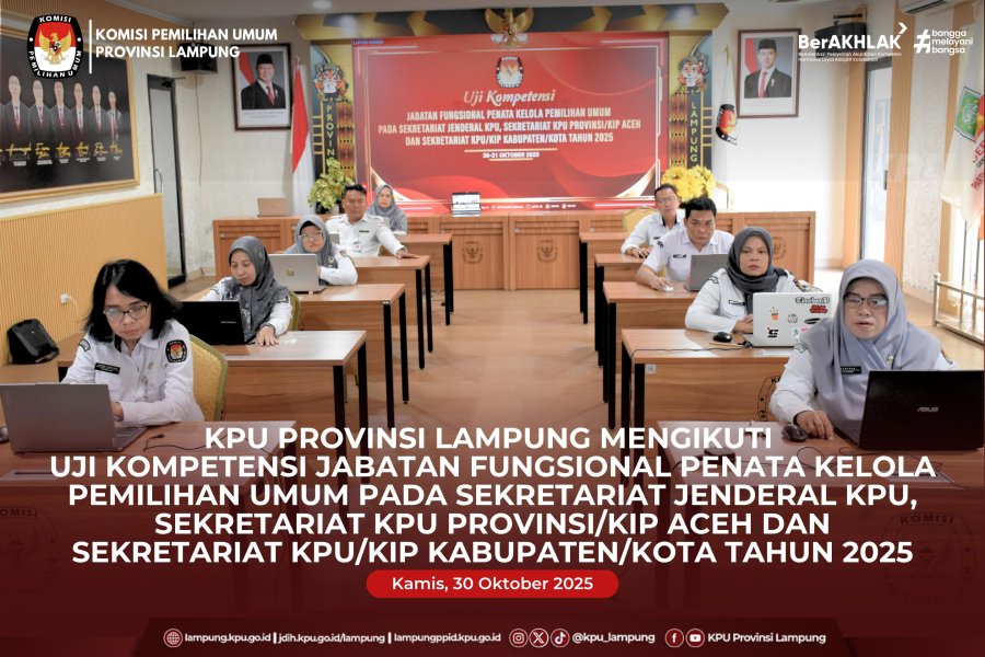 19 Staf KPU Lampung Ikuti Uji Kompetensi Jabatan Fungsional Penata Kelola Pemilu di Aula KPU Provinsi Lampung. Bandar Lampung – Sebanyak 19 orang staf Pelaksana Komisi Pemilihan Umum (KPU) Provinsi Lampung mengikuti kegiatan Uji Kompetensi Jabatan Fungsional Penata Kelola Pemilihan Umum (JF PKPU) pada Sekretariat Jenderal KPU, Sekretariat KPU Provinsi/KIP Aceh dan Sekretariat KPU/KIP Kabupaten/Kota Tahun 2025. Kegiatan ini diselenggarakan oleh Sekretariat Jenderal KPU RI pada hari Kamis s.d Jumat tanggal 30-31 Oktober 2025.