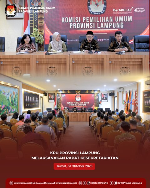 KPU Provinsi Lampung menggelar Rapat Kesekretariatan, sebagai tindak lanjut dari rapat pleno rutin mingguan yang telah dilaksanakan pada Selasa, 28 Oktober 2025.
