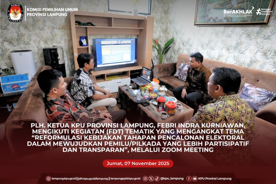 Plh.Ketua KPU Provinsi Lampung, Febri Indra Kurniawan, mengikuti kegiatan Forum Diskusi Terpumpun (FDT) Tematik yang mengangkat tema Reformulasi Kebijakan Tahapan Pencalonan Elektoral dalam Mewujudkan Pemilu/Pilkada yang Lebih Partisipatif dan Transparan