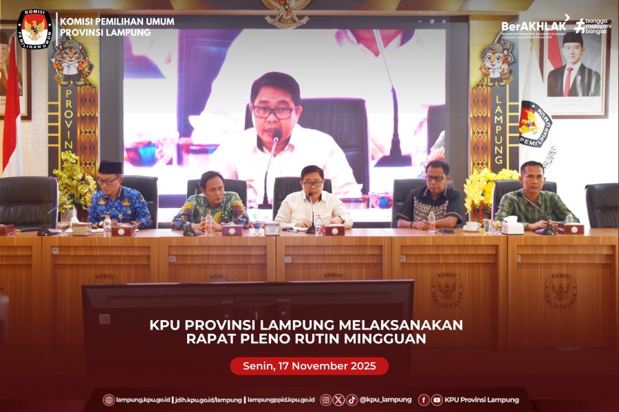 KPU Provinsi Lampung melaksanakan Rapat Pleno Rutin Mingguan bertempat di Aula Kantor KPU Provinsi Lampung. Rapat dipimpin oleh Ketua KPU Provinsi Lampung, Erwan Bustami, serta dihadiri oleh Anggota KPU Provinsi Lampung: Angga Lazuardy, Dedi Fernando, dan Ahmad Zamroni. Sementara itu, Anggota KPU Provinsi Lampung, Ervhan Jaya dan Febri Indra Kurniawan mengikuti rapat secara daring.