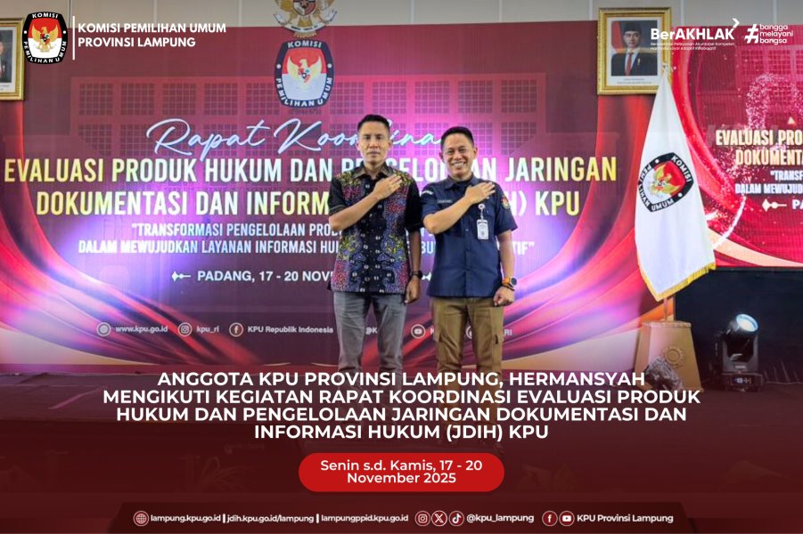 Anggota KPU Provinsi Lampung sekaligus Ketua Divisi Hukum dan Pengawasan, Hermansyah, bersama Kabag Teknis dan Hukum, Yustian Umri Sangon, mengikuti Rapat Koordinasi Evaluasi Produk Hukum dan Pengelolaan Jaringan Dokumentasi dan Informasi Hukum (JDIH) KPU.
