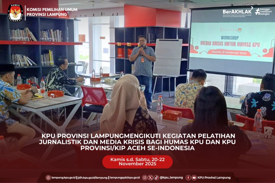 Kepala Subbagian Partisipasi dan Hubungan Masyarakat KPU Provinsi Lampung, Mohd Ade Candra, mengikuti Pelatihan Jurnalistik dan Media Krisis bagi Humas KPU dan KPU Provinsi/KIP Aceh se-Indonesia yang berlangsung pada Kamis–Sabtu, 20–22 November 2025. Kegiatan hasil kolaborasi antara KPU RI dan Tempo Media ini diselenggarakan di Kantor Tempo Media.