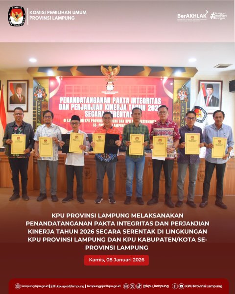 Komisi Pemilihan Umum (KPU) Provinsi Lampung melaksanakan Penandatanganan Pakta Integritas dan Perjanjian Kinerja Tahun 2026 secara serentak di lingkungan KPU Provinsi Lampung dan KPU Kabupaten/Kota se-Provinsi Lampung