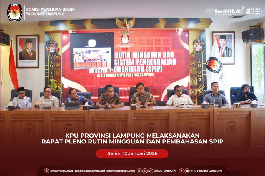 KPU Provinsi Lampung melaksanakan Rapat Pleno Rutin Mingguan dan Pembahasan Sistem Pengendalian Intern Pemerintah (SPIP) pada Senin (12/1/2026). Kegiatan berlangsung di Aula Kantor KPU Provinsi Lampung sebagai bagian dari agenda konsolidasi internal dan penguatan tata kelola kelembagaan.