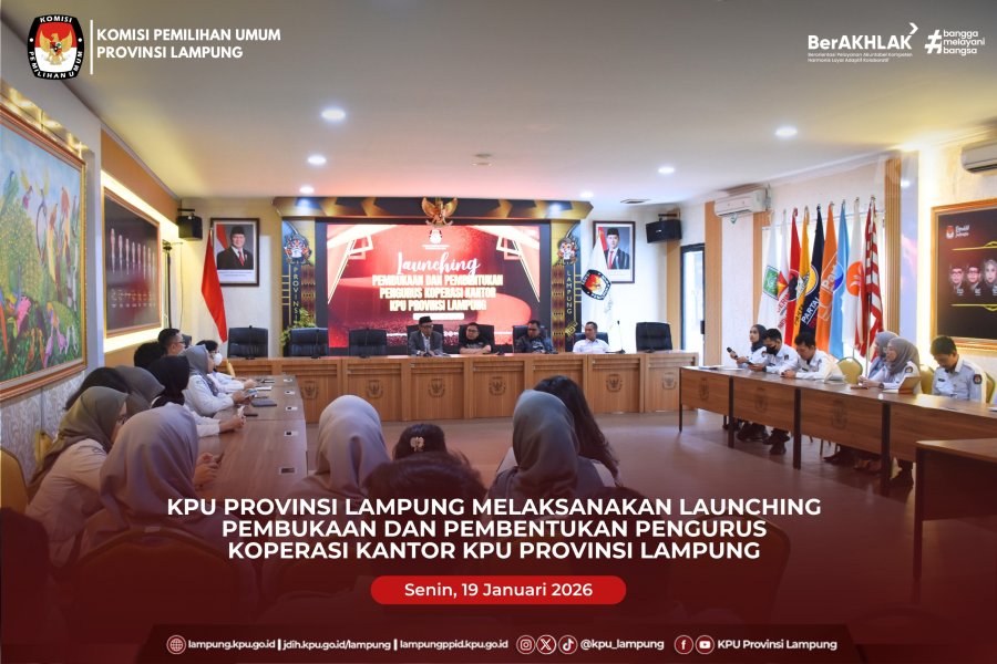 KPU Provinsi Lampung melaksanakan kegiatan Launching Pembukaan dan Pembentukan Pengurus Koperasi KPU Mart (Koperasi Pegawai KPU Provinsi Lampung), Senin (19/1/2026), bertempat di Aula Kantor KPU Provinsi Lampung. Kegiatan ini dibuka oleh Ketua KPU Provinsi Lampung, Erwan Bustami, serta dihadiri Anggota KPU Provinsi Lampung Angga Lazuardy dan Dedi Fernando, Sekretaris KPU Provinsi Lampung Arif Ma’ruf, jajaran kepala bagian, kepala subbagian, pejabat fungsional, dan staf KPU Provinsi Lampung.