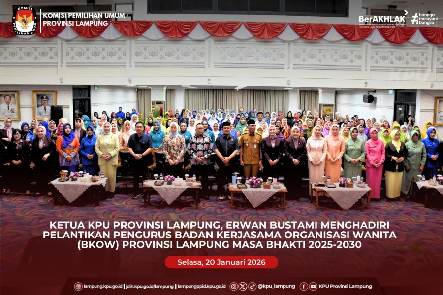 Ketua KPU Provinsi Lampung, Erwan Bustami menghadiri Pelantikan Pengurus Badan Kerjasama Organisasi Wanita (BKOW) Provinsi Lampung Masa Bhakti 2025–2030, Selasa (20/1/2026). Kegiatan yang dilaksanakan di Balai Keratun Lantai III Kantor Gubernur Lampung mengusung tema “Sinergitas BKOW dalam Mewujudkan Perempuan Berdaya Menuju Lampung Maju”.