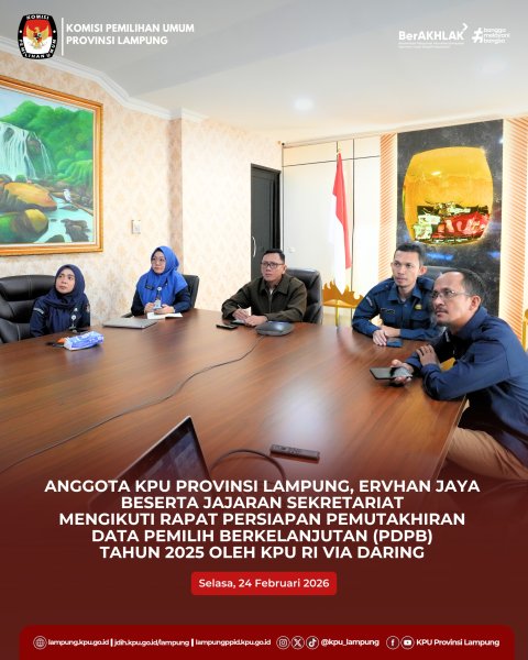 KPU Provinsi Lampung mengikuti kegiatan Rapat Persiapan PDPB Tahun 2026 yang diselenggarakan oleh KPU RI secara daring melalui zoom meeting, Selasa (24/2/2026).