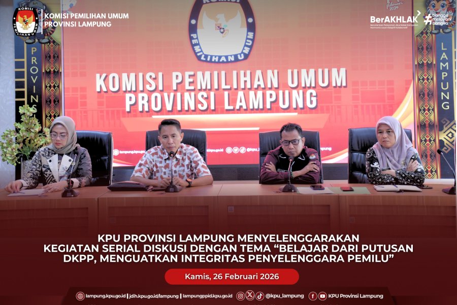 Dalam rangka Peningkatan Kapasitas SDM KPU Se-Provinsi Lampung, KPU Provinsi Lampung melaksanakan kegiatan Serial Diskusi dengan Tema "Belajar dari Putusan DKPP, Menguatkan Integritas Penyelenggara Pemilu", pada hari Kamis tanggal 26 Februari 2026 bersama KPU Kabupaten/Kota Se-Provinsi lampung melalui media daring (zoom meeting).