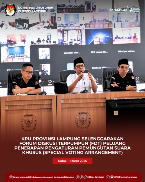 #Temanpemilih, Anggota KPU Provinsi Lampung, Febri Indra Kurniawan didampingi oleh Kabag Teknis dan Hukum, Yustian Umri Sangon dan Kasubag Teknis penyelenggaraan Pemilu, Ismail As’ad membuka kegiatan Forum Diskusi Terpumpun (FDT) Peluang Penerapan Pengaturan Pemungutan Suara Khusus (Special Voting Arrangement/SVA) yang diikuti oleh KPU kabupaten/Kota se-Provinsi Lampung via daring, Rabu (11/03/2026).