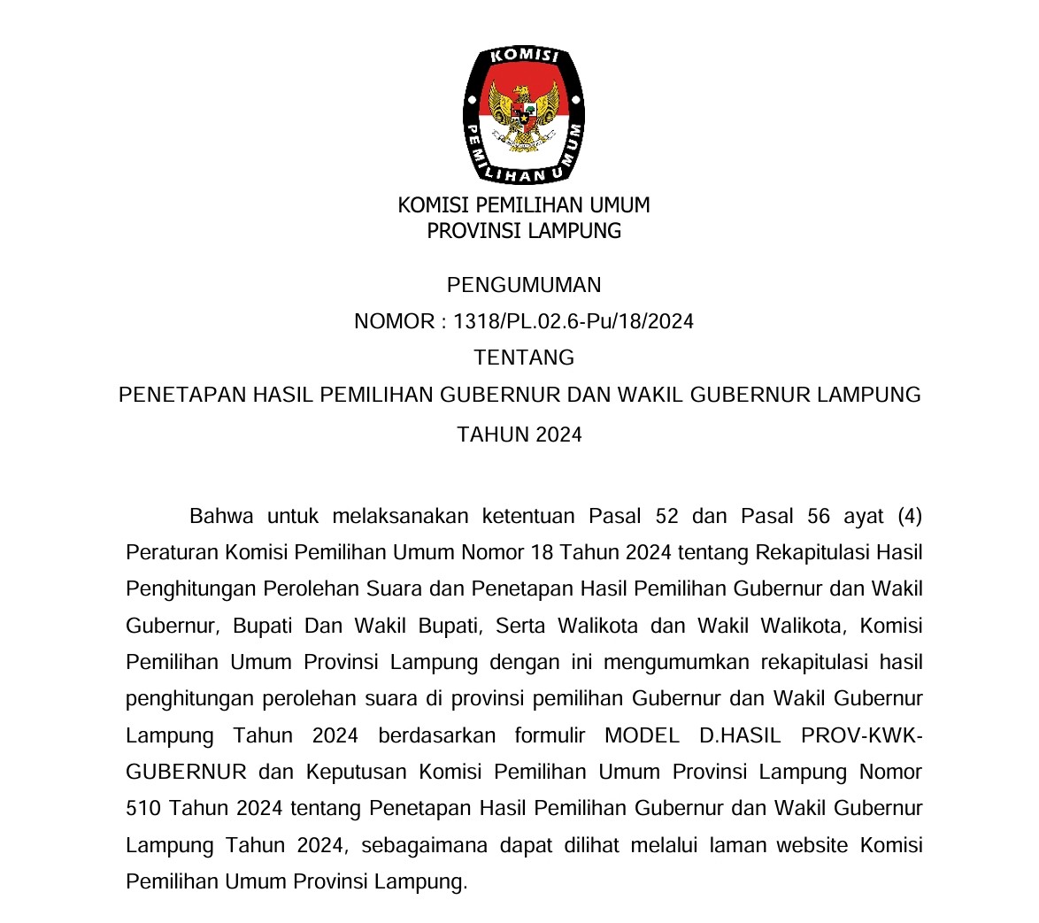 PENETAPAN HASIL PEMILIHAN GUBERNUR DAN WAKIL GUBERNUR LAMPUNG TAHUN 2024
