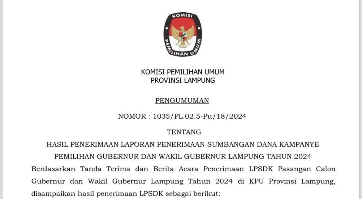 Berdasarkan Tanda Terima dan Berita Acara Penerimaan LPSDK Pasangan Calon Gubernur dan Wakil Gubernur Lampung Tahun 2024 di KPU Provinsi Lampung, disampaikan hasil penerimaan LPSDK sebagai berikut: https://drive.google.com/drive/folders/1PZBK04ZFAHzN1JfeKUT4Ig3TJQjjJoc4