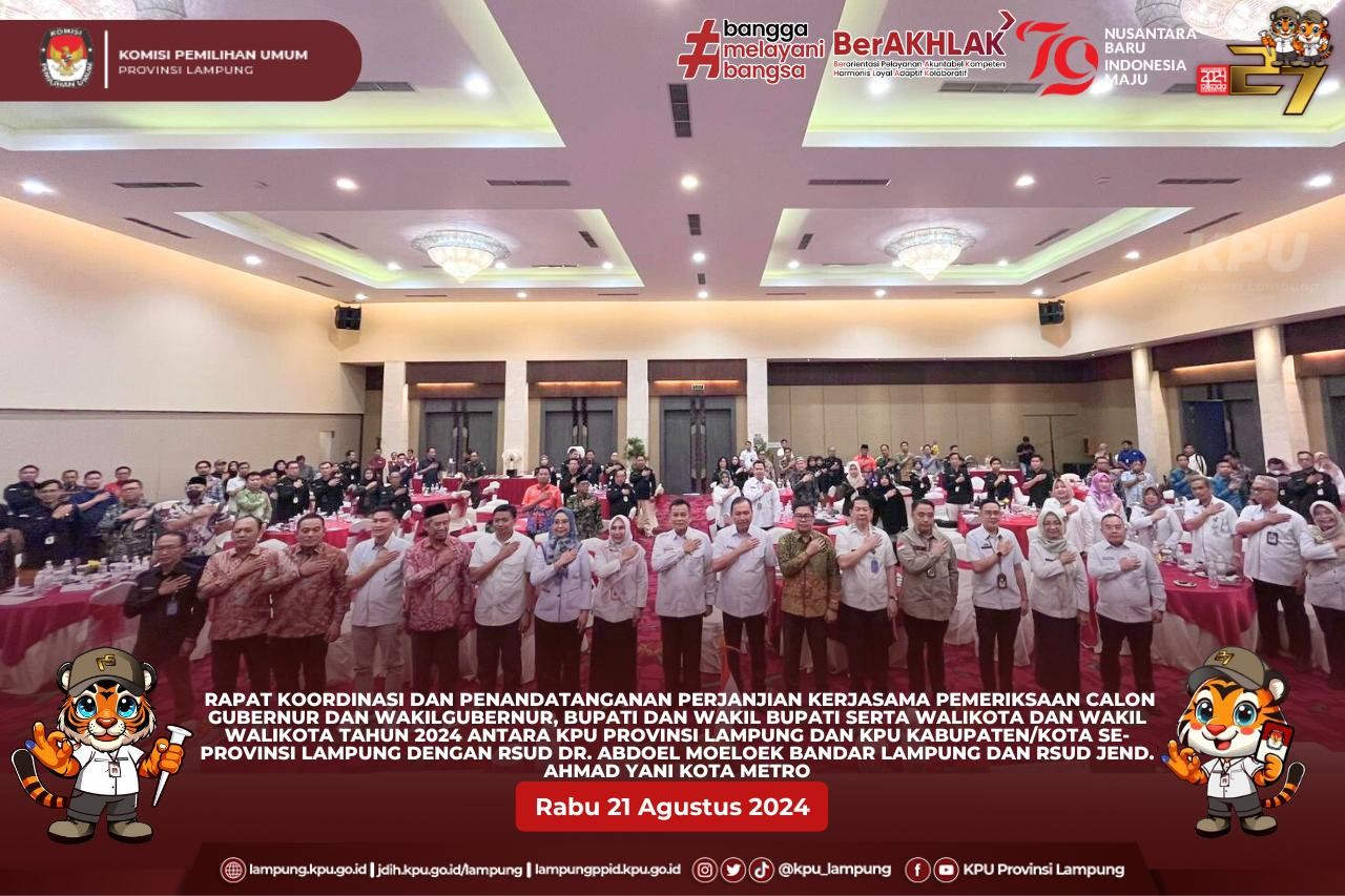 (Rabu, 21 Agustus 2024) Ketua KPU Provinsi Lampung Erwan Bustami, Anggota KPU KPU Provinsi Lampung Ismanto, Ali Sidik, Warsito, Agus Riyanto serta Plt. Sekretaris KPU Provinsi Lampung Arif Ma’ruf melaksanakan Rapat Koordinasi dan Penandatanganan Perjanjian Kerjasama Pemeriksaan Calon Gubernur dan Wakil Gubernur, Bupati dan Wakil Bupati serta Walikota dan Wakil Walikota Tahun 2024 antara KPU Provinsi Lampung dan KPU Kabupaten/Kota se-Provinsi Lampung dengan RSUD dr. Abdoel Moeloek Bandar Lampung dan RSUD Jend. Ahmad Yani Kota Metro di Hotel Emersia Bandar Lampung.