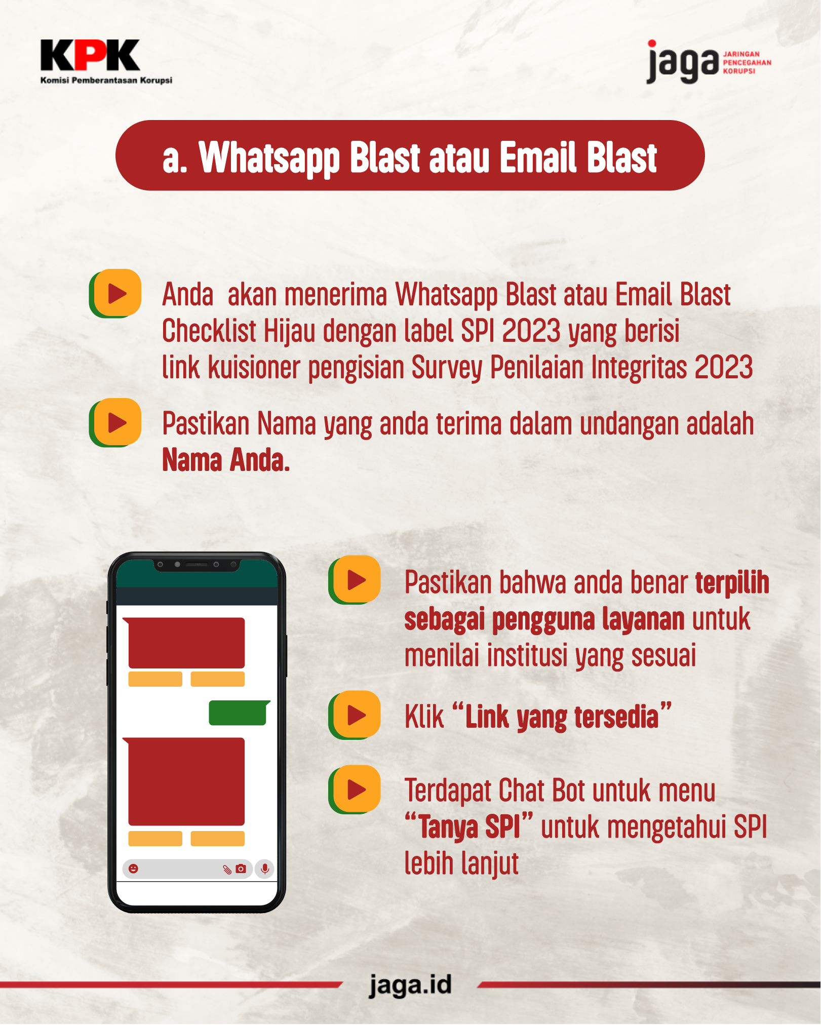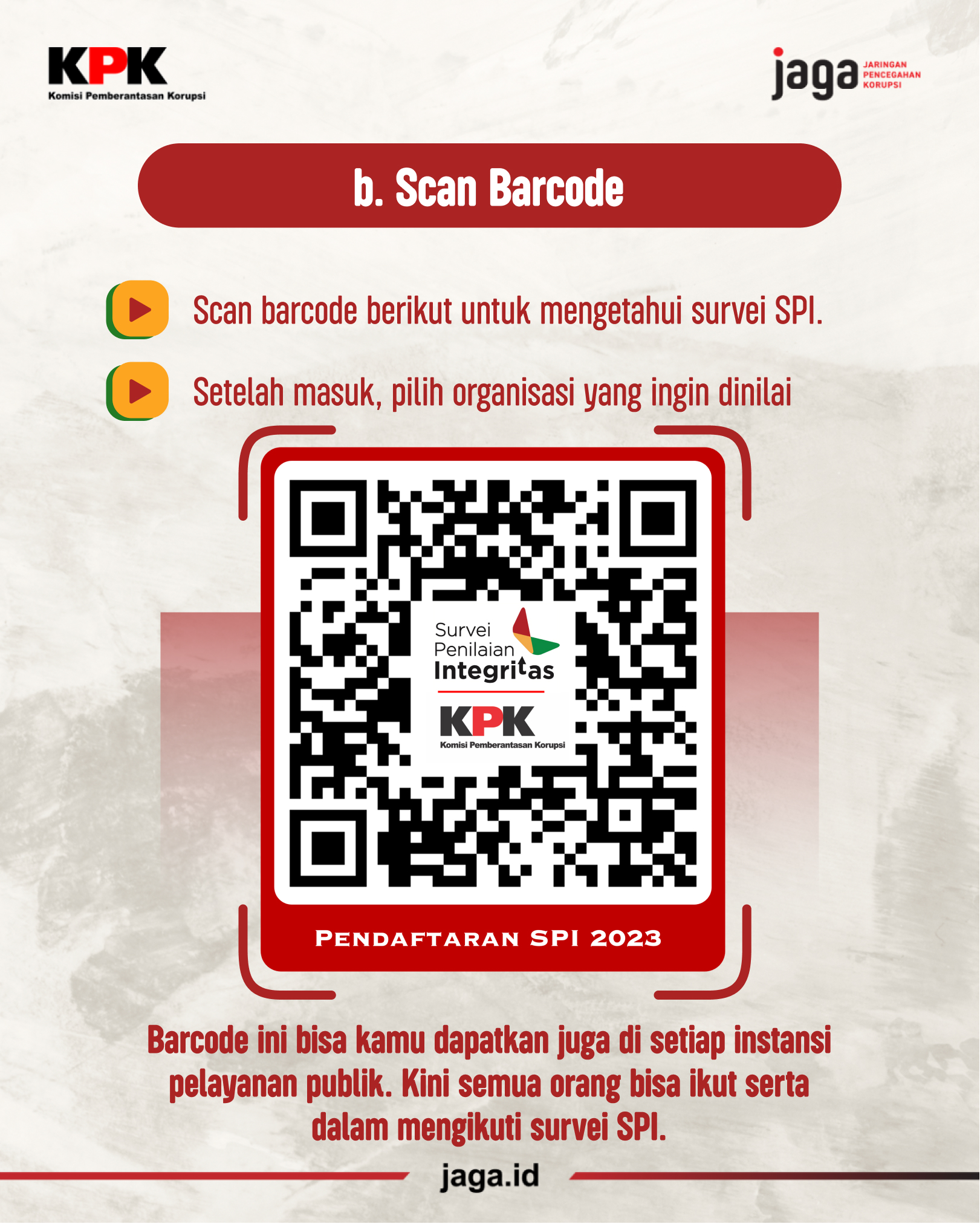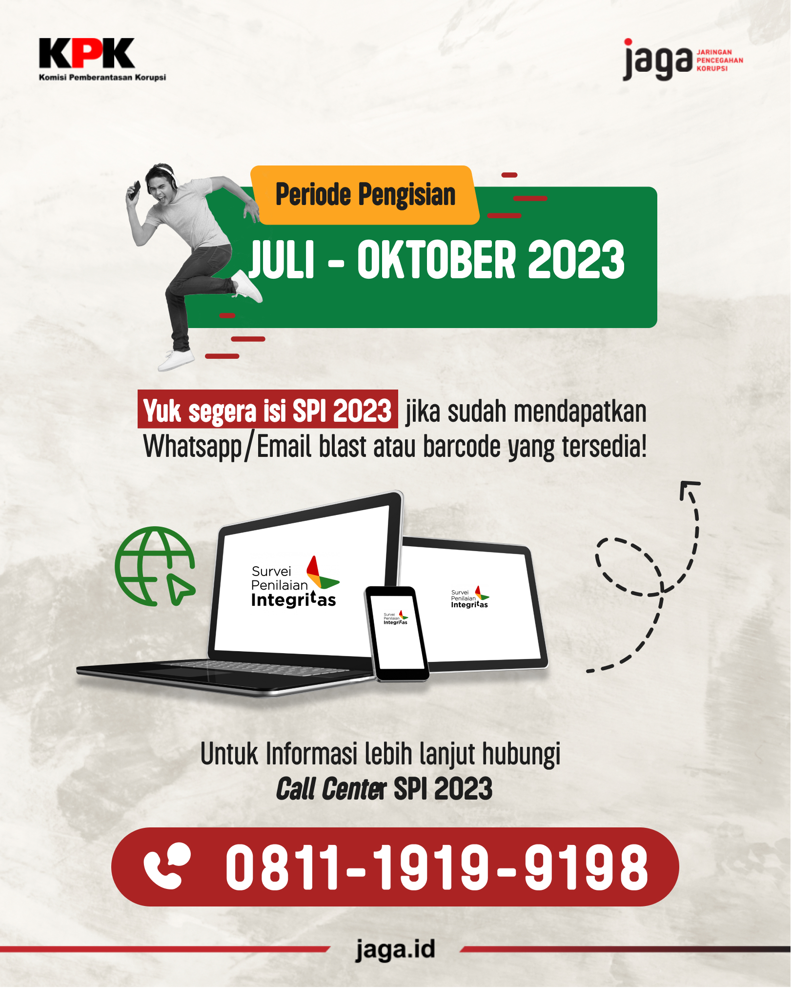 #TemanPemilih, Ayooo sukseskan Survei Penilaian Integritas (SPI) 2023. Yuk segera isi SPI 2023 jika sudah mendapatkan Whatsapp/Email blast atau barcode yang tersedia. Untuk Informasi lebih lanjut hubungi Call Center SPI 2023 di 081119199198.