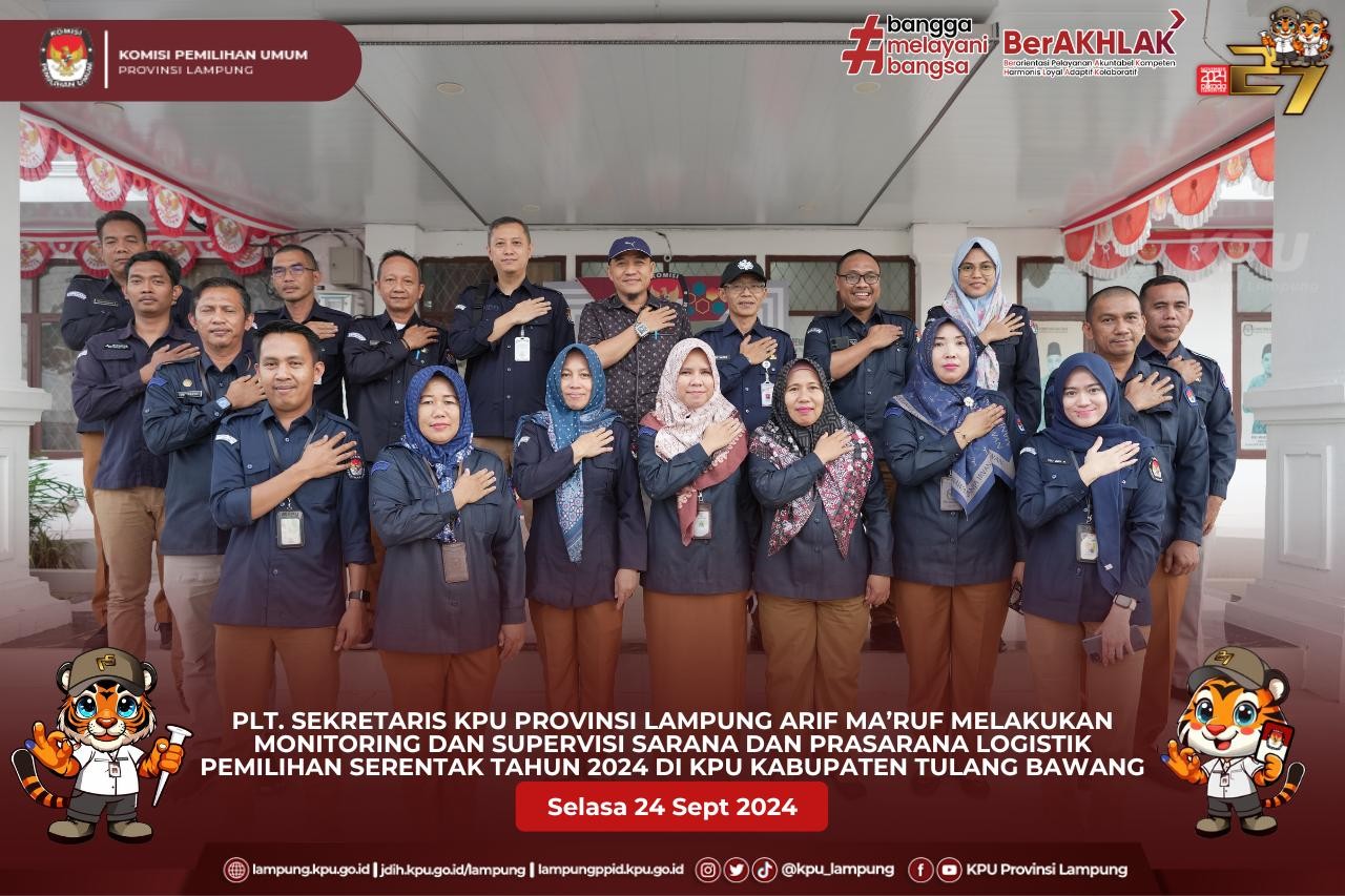 (Selasa, 24 September 2024) Plt Sekertaris KPU Provinsi Lampung Arif Ma'ruf, didampingi Kasubag Umlog KPU Provinsi Lampung Azriando Cahya Negara melakukan Monitoring dan Supervisi Sarana dan Prasarana Logistik Pemilihan Serentak Tahun 2024 di KPU Kabupaten Tulang Bawang.