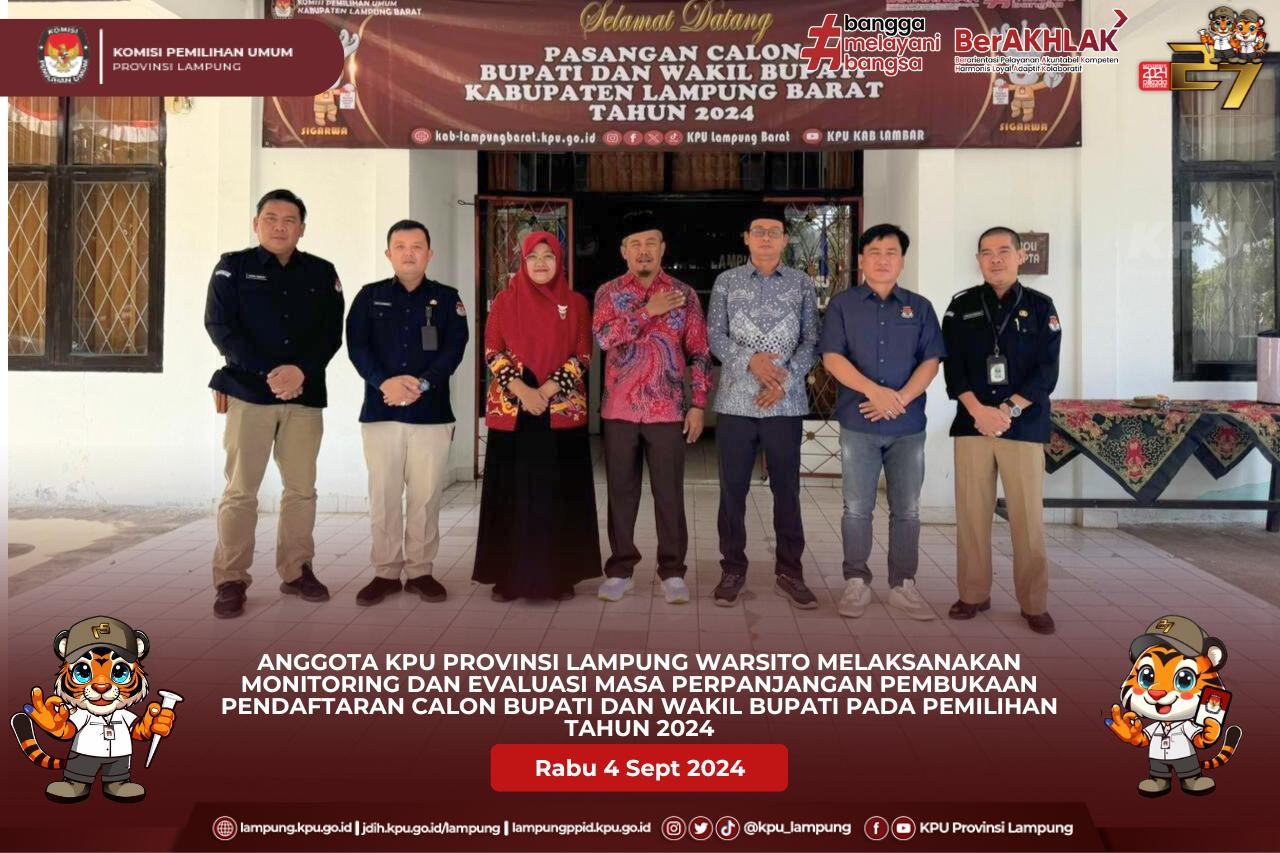 (Rabu 04 September 2024) Anggota KPU Provinsi Lampung Warsito melaksanakan Monitoring dan Evaluasi Masa Perpanjangan Pembukaan Pendaftaran Calon Bupati dan Wakil Bupati pada Pemilihan Tahun 2024 di KPU Kabupaten Lampung Barat.