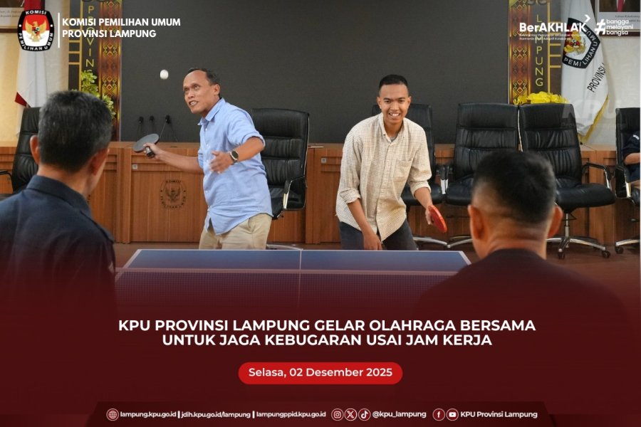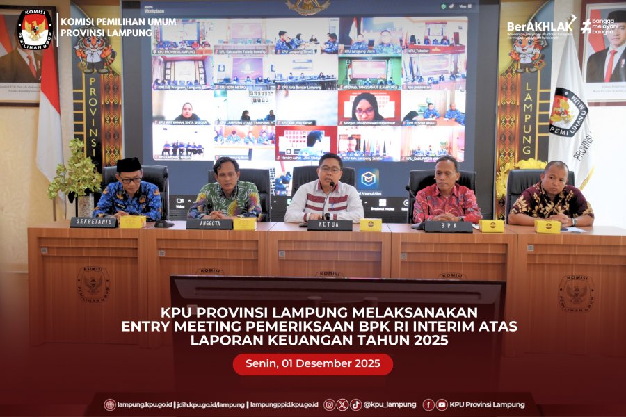 KPU Provinsi Lampung melaksanakan Entry Meeting Pemeriksaan BPK RI Interim atas Laporan Keuangan Tahun 2025, Senin (1/12/2025), bertempat di Aula KPU Provinsi Lampung. Kegiatan ini diikuti oleh Ketua KPU Provinsi Lampung Erwan Bustami, Anggota KPU Provinsi Lampung Ahmad Zamroni, Sekretaris KPU Provinsi Lampung Arif Ma’ruf, jajaran kepala bagian, kepala subbagian, pejabat fungsional, pengelola keuangan, serta KPU Kabupaten Pesawaran.