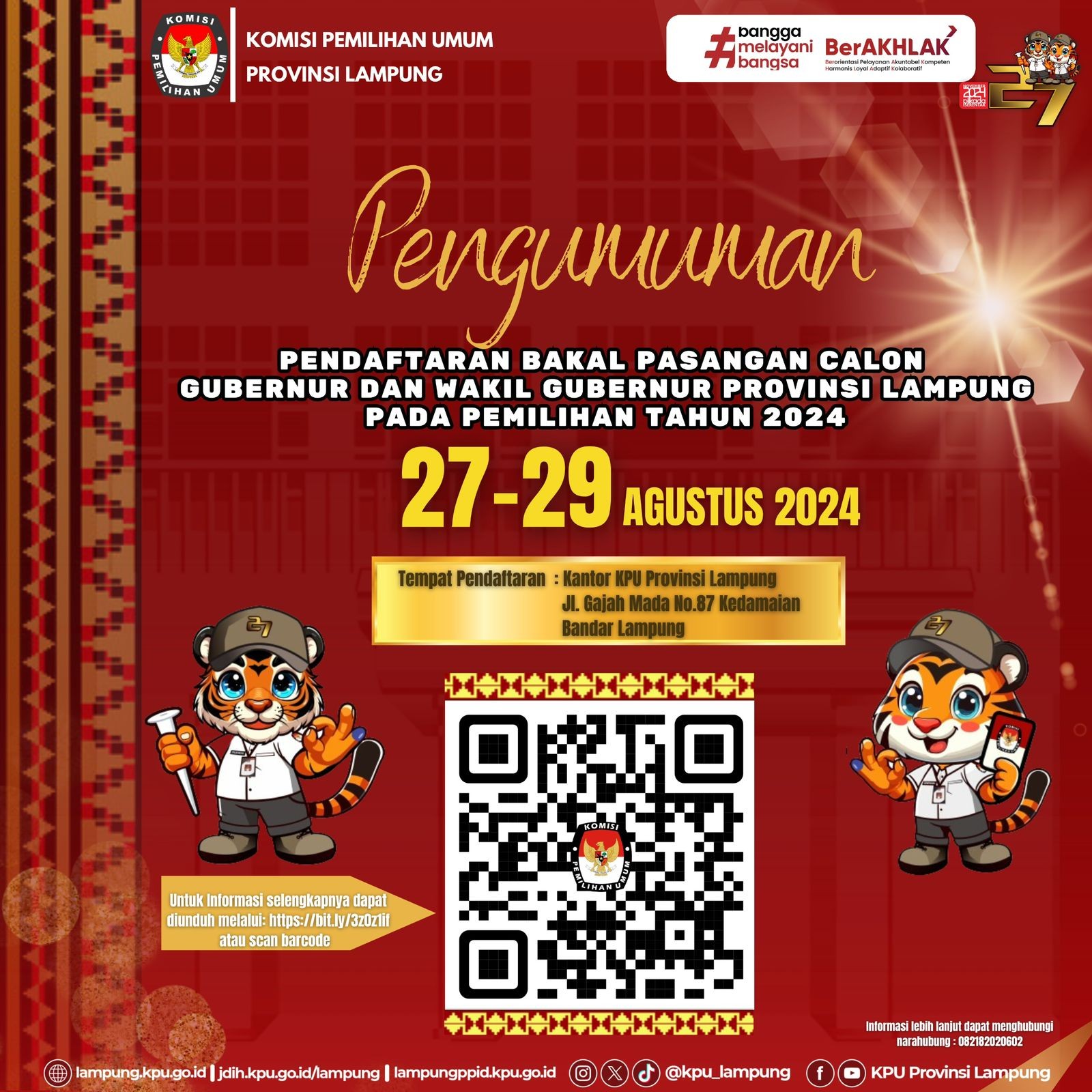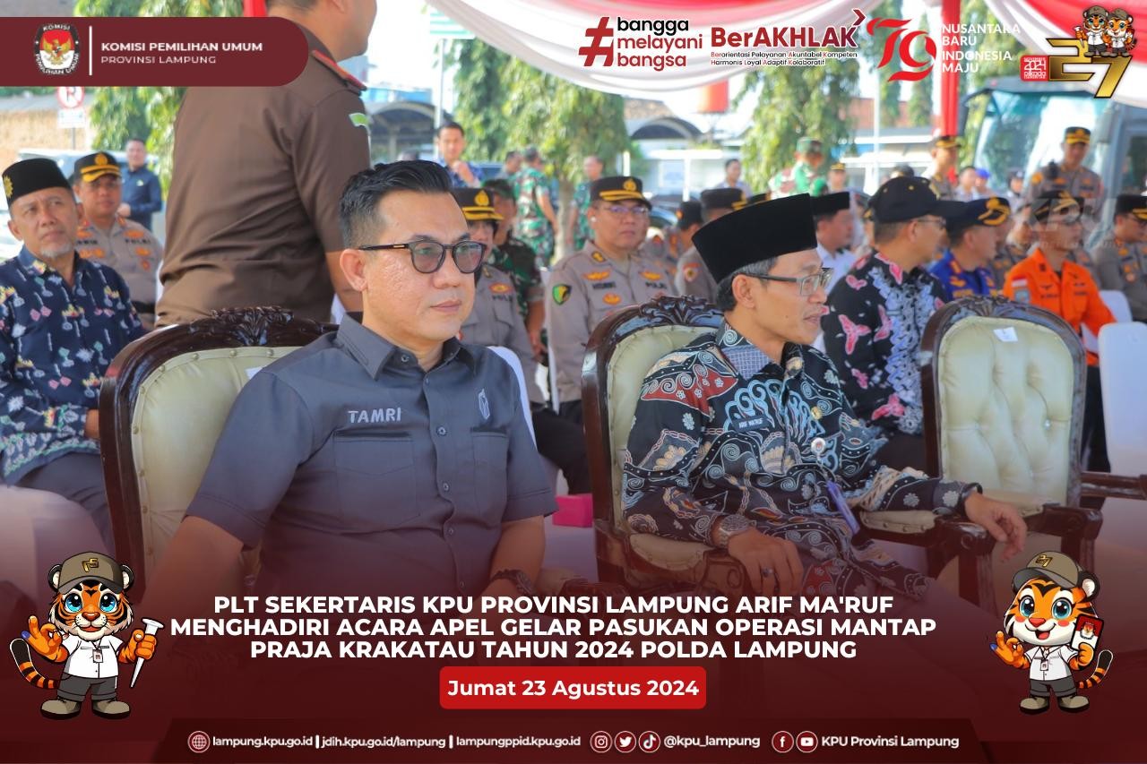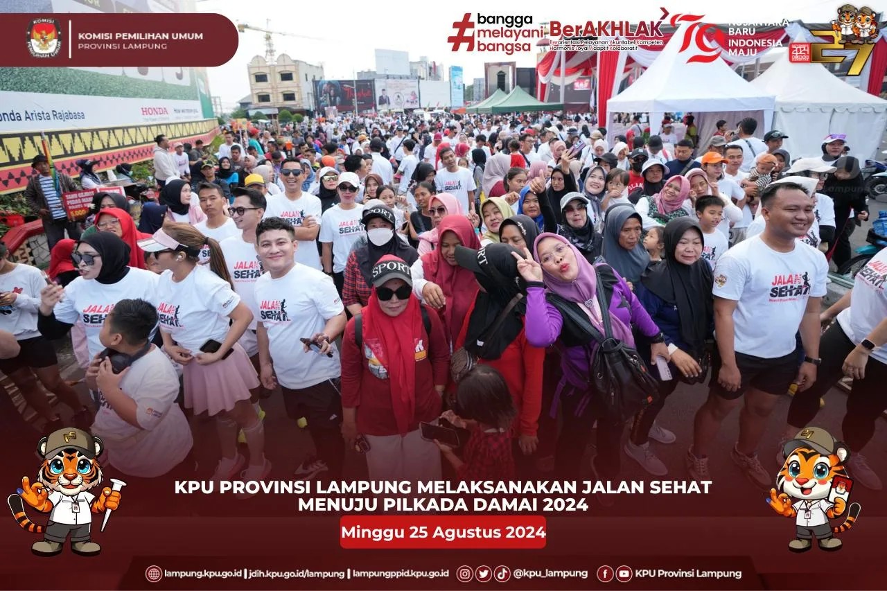 (Minggu 25 Agustus 2024) KPU Provinsi Lampung menggelar even tematik Jalan Sehat menuju Pilkada Damai 2024 di Tugu Adipura Bandar Lampung, Jalan Sehat gratis dan terbuka untuk umum dimulai dari jam 06.00 WIB dengan mengambil rute dimulai dari start sekaligus finis area Tugu Adipura (Bundaran Gajah) Enggal Bandar Lampung.
