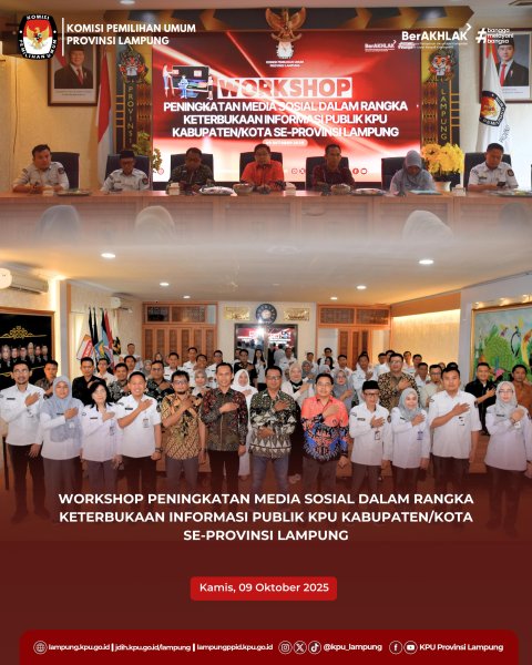 KPU Provinsi Lampung menggelar Workshop Peningkatan Media Sosial dalam Rangka Keterbukaan Informasi Publik yang diikuti oleh KPU Kabupaten/Kota se-Provinsi Lampung. Kegiatan ini dilaksanakan di Aula Kantor KPU Provinsi Lampung.
