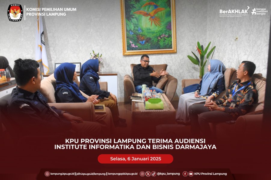 #TemanPemilih, Komisi Pemilihan Umum (KPU) Provinsi Lampung menerima audiensi dari Institute Informatika dan Bisnis (IIB) Darmajaya, Selasa (6/1/2025), bertempat di Ruang Kerja Ketua Divisi SDM dan Litbang KPU Provinsi Lampung. Audiensi tersebut diterima oleh Anggota KPU Provinsi Lampung selaku Ketua Divisi SDM dan Litbang Angga Lazuardy, didampingi Kepala Bagian SDM dan Parmas Erika Firdiyanti, Kepala Subbagian SDM Narita Hayunanda, serta Kepala Subbagian Partisipasi dan Hubungan Masyarakat Mohd Ade Candra. Dalam pertemuan tersebut, pihak IIB Darmajaya, Dian Eka Darmawahyuni, selaku Direktur Humas, Kerjasama & Pemasaran menyampaikan informasi serta menawarkan program pendidikan pascasarjana Strata Dua (S2), baik melalui jalur reguler maupun Rekognisi Pembelajaran Lampau (RPL), sebagai upaya peningkatan kapasitas dan kompetensi sumber daya manusia. Selain itu, IIB Darmajaya juga membuka peluang kerja sama dengan KPU Provinsi Lampung, termasuk penyediaan narasumber atau pemateri yang berkaitan dengan bidang teknologi dan bisnis. Pada kesempatan yang sama, pihak IIB Darmajaya juga menyampaikan kesiapan untuk memfasilitasi kegiatan sosialisasi kepemiluan apabila KPU Provinsi Lampung melaksanakan kegiatan edukasi pemilih di lingkungan kampus, sebagai bentuk dukungan terhadap peningkatan literasi demokrasi dan partisipasi pemilih, khususnya di kalangan civitas akademika. Angga Lazuardy menyambut baik audiensi tersebut dan mengapresiasi inisiatif IIB Darmajaya dalam menjalin komunikasi serta menawarkan berbagai bentuk kolaborasi. Menurutnya, sinergi antara KPU dan institusi pendidikan tinggi memiliki peran strategis dalam penguatan kapasitas SDM sekaligus mendukung perluasan jangkauan sosialisasi kepemiluan yang edukatif dan berkelanjutan. Audiensi berlangsung dalam suasana dialogis dan konstruktif, serta diharapkan dapat menjadi langkah awal untuk menjajaki kerja sama yang saling mendukung dalam pengembangan sumber daya manusia dan penguatan demokrasi di Provinsi Lampung. #KPULampung #KPUMelayani