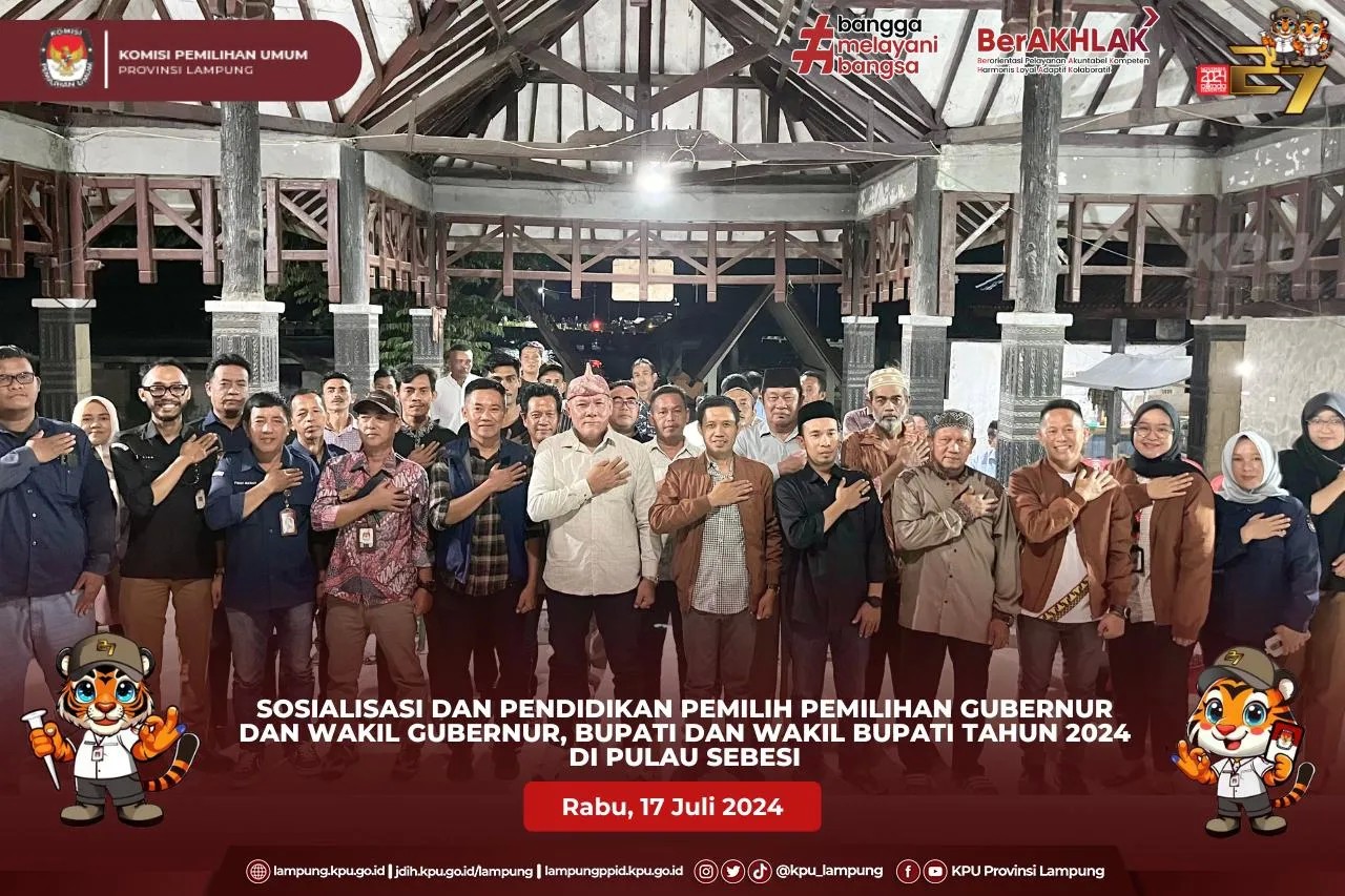 ( (Rabu, 17 Juli 2024), Anggota KPU Provinsi Lampung Antoniyus serta Plh. Sekretaris Yustian (Rabu, 17 Juli 2024), Anggota KPU Provinsi Lampung Antoniyus serta Plh. Sekretaris Yustian (Rabu, 17 Juli 2024), Anggota KPU Provinsi Lampung Antoniyus serta Plh. Sekretaris Yustian Umri Sangon menghadiri Sosialisasi dan Pendidikan Pemilih Pemilihan Gubernur dan Wakil Gubernur, Bupati dan Wakil Bupati Tahun 2024 oleh KPU Kabupaten Lampung Selatan di Desa Tejang Pulau Sebesi Rajabasa Lampung Selatan. Pada kesempatan ini, Antoniyus memberikan pengetahuan kepada masyarakat pulau sebesi pentingnya memilih calon yang memiliki kesadaran politik dan demokrasi untuk memajukan daerah yang mereka tempati sekarang. Antoniyus juga berharap dengan adanya sosialisasi ini masyarakat pulau sebesi lebih dapat miliki pemahaman tentang proses demokrasi pada pemilihan serentak 27 november 2024. Kegiatan ini juga dihadiri oleh KPU Kabupaten Lampung Selatan, pangeran punyimbang agung sai batin marga rajabasa, ppk kec. raja basa dan pps desa tejan pulau sebesi, dan masyarakat pulau sebesi. Sangon menghadiri Sosialisasi dan Pendidikan Pemilih Pemilihan Gubernur dan Wakil Gubernur, Bupati dan Wakil Bupati Tahun 2024 oleh KPU Kabupaten Lampung Selatan di Desa Tejang Pulau Sebesi Rajabasa Lampung Selatan. Pada kesempatan ini, Antoniyus memberikan pengetahuan kepada masyarakat pulau sebesi pentingnya memilih calon yang memiliki kesadaran politik dan demokrasi untuk memajukan daerah yang mereka tempati sekarang. Antoniyus juga berharap dengan adanya sosialisasi ini masyarakat pulau sebesi lebih dapat miliki pemahaman tentang proses demokrasi pada pemilihan serentak 27 november 2024. Kegiatan ini juga dihadiri oleh Anggota KPU Lampung Selatan, tim sekretariat KPU kalianda, pangeran kalianda, ppk dan pps pulau sebesi, dan masyarakat pulau sebesi. Sangon menghadiri Sosialisasi dan Pendidikan Pemilih Pemilihan Gubernur dan Wakil Gubernur, Bupati dan Wakil Bupati Tahun 2024 oleh KPU Kabupaten Lampung Selatan di Desa Tejang Pulau Sebesi Rajabasa Lampung Selatan. Pada kesempatan ini, Antoniyus memberikan pengetahuan kepada masyarakat pulau sebesi pentingnya memilih calon yang memiliki kesadaran politik dan demokrasi untuk memajukan daerah yang mereka tempati sekarang. Antoniyus juga berharap dengan adanya sosialisasi ini masyarakat pulau sebesi lebih dapat miliki pemahaman tentang proses demokrasi pada pemilihan serentak 27 november 2024. Kegiatan ini juga dihadiri oleh tim sekretariat KPU kalianda, pangeran kalianda, ppk dan pps pulau sebesi, dan masyarakat pulau sebesi. , 17 Juli 2024), Anggota KPU Provinsi Lampung Antoniyus serta Plh. Sekretaris Yustian Umri Sangon melaksanakan Sosialisasi dan Pendidikan Pemilih Pemilihan Gubernur dan Wakil Gubernur, Bupati dan Wakil Bupati Tahun 2024 di Vila Sebesi Desa Tejang Pulau Sebesi Rajabasa Lampung Selatan. Pada kesempatan ini, Antoniyus memberikan pengetahuan kepada masyarakat pulau sebesi pentingnya memilih calon yang memiliki kesadaran politik dan demokrasi untuk memajukan daerah yang mereka tepati sekarang. Antoniyus juga berharap dengan adanya sosialisasi ini masyarakat pulau sebesi lebih dapat memiliki pemahaman tentang proses demokrasi pada pemilihan serentak 27 november 2024. Kegiatan ini juga dihadiri oleh tim sekretariat KPU kalianda, pangeran kalianda, ppk dan pps pulau sebesi, dan masyarakat pulau sebesi.