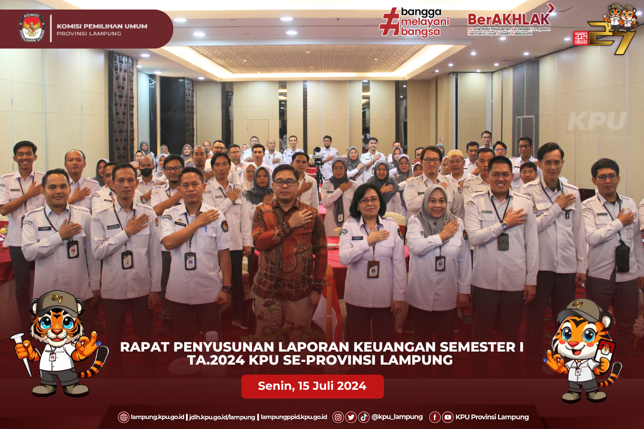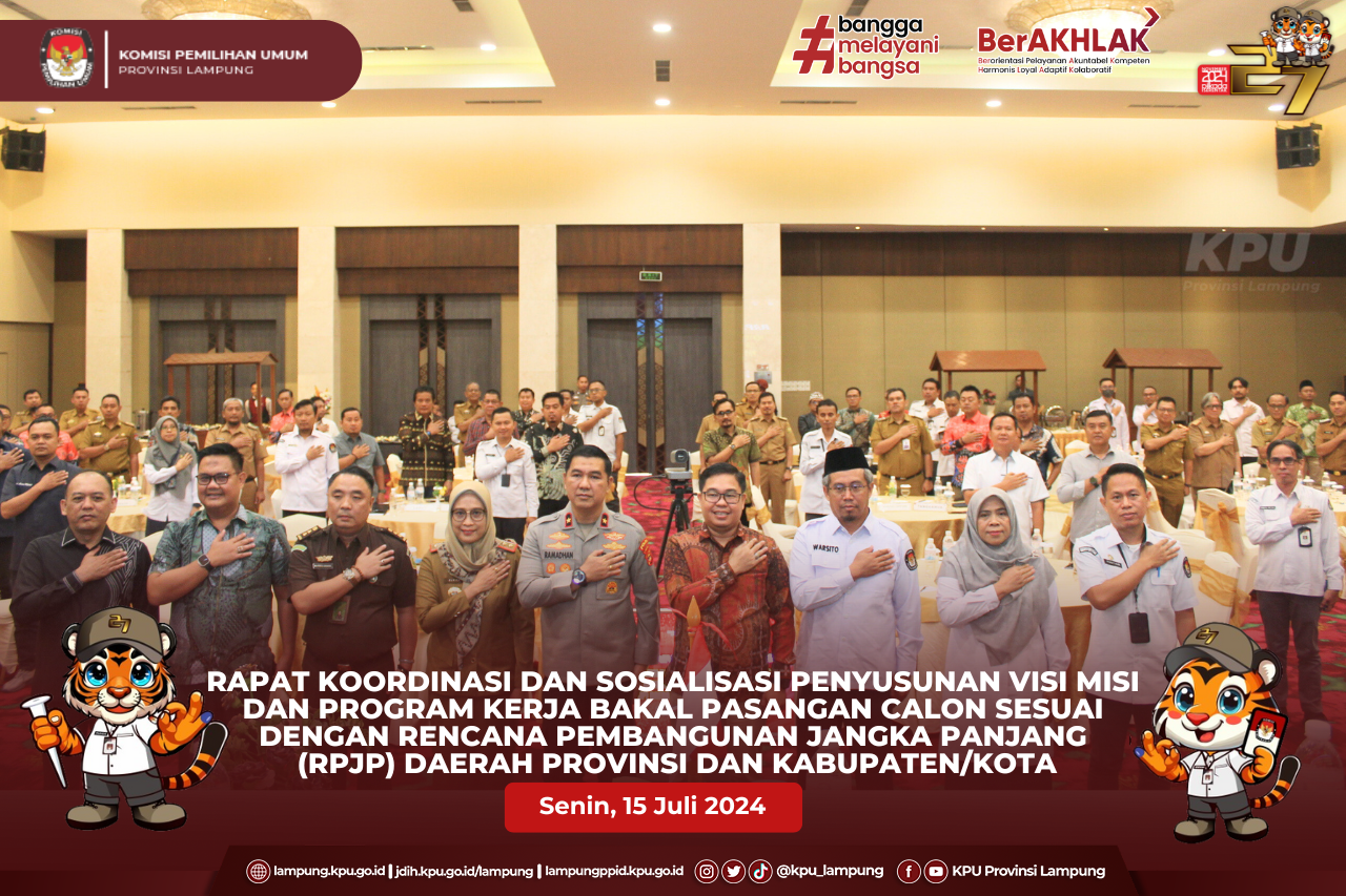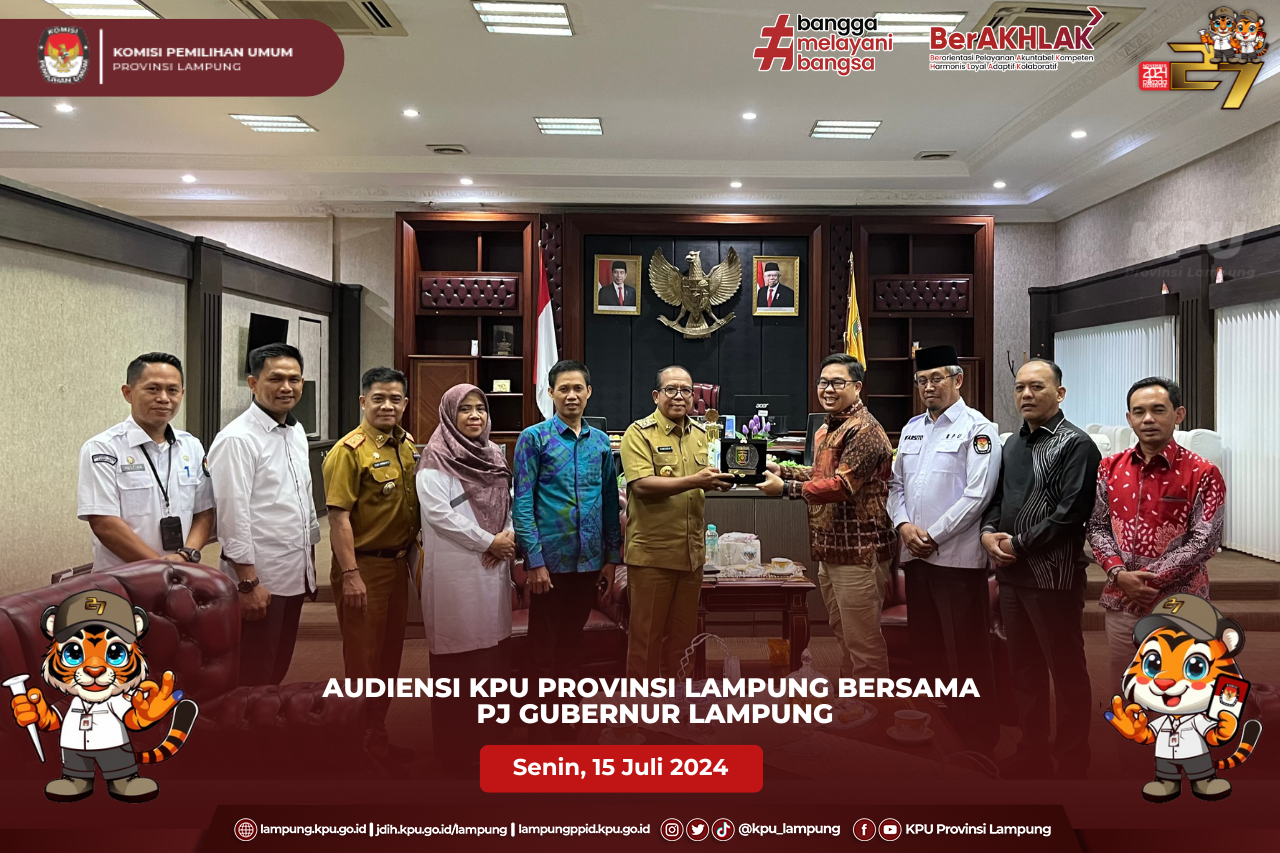 (Senin, 15 Juli 2024) Ketua KPU Provinsi Lampung Erwan Bustami, Anggota KPU Provinsi Lampung Antoniyus, Ali Sidik, Titik Sutriningsih, Warsito, Agus Riyanto beserta Plh. Sekretaris KPU Provinsi Lampung Yustian Umri Sangon, melaksanakan audiensi bersama PJ Gubernur Lampung bertempat di Kantor Gubernur. Kegiatan audiensi KPU Provinsi Lampung Bersama PJ Gubernur Lampung dalam rangka silaturahmi serta pemberitahuan persiapan pelaksanaan tahapan Pilkada serentak tahun 2024 yang sedang berjalan di Provinsi Lampung, pada kesempatan ini Ketua KPU Provinsi Lampung, Erwan Bustami menjelaskan dalam proses pelaksanaan Pemilihan Serentak saat ini, KPU Provinsi Lampung sedang dalam Proses pencocokan data Pemilih yang sedang dilaksanakan oleh Pantarlih. PJ Gubernur Lampung Dr. Drs. Samsudin S.H., M.H., M.Pd mengapresiasi pencapaian Komisi Pemilihan Umum Provinsi Lampung yang telah berhasil menyelenggarakan Pemilihan Umum Serentak Tahun 2024 di Provinsi Lampung, beliau juga berharap keberhasilan KPU Provinsi Lampung dalam melaksanakan Pemilu di Provinsi lampung dapat diulang Kembali pada Pemilihan Kepala Daerah Serentak Tahun 2024 yang akan diselenggarakan pada hari rabu, 27 November 2024.
