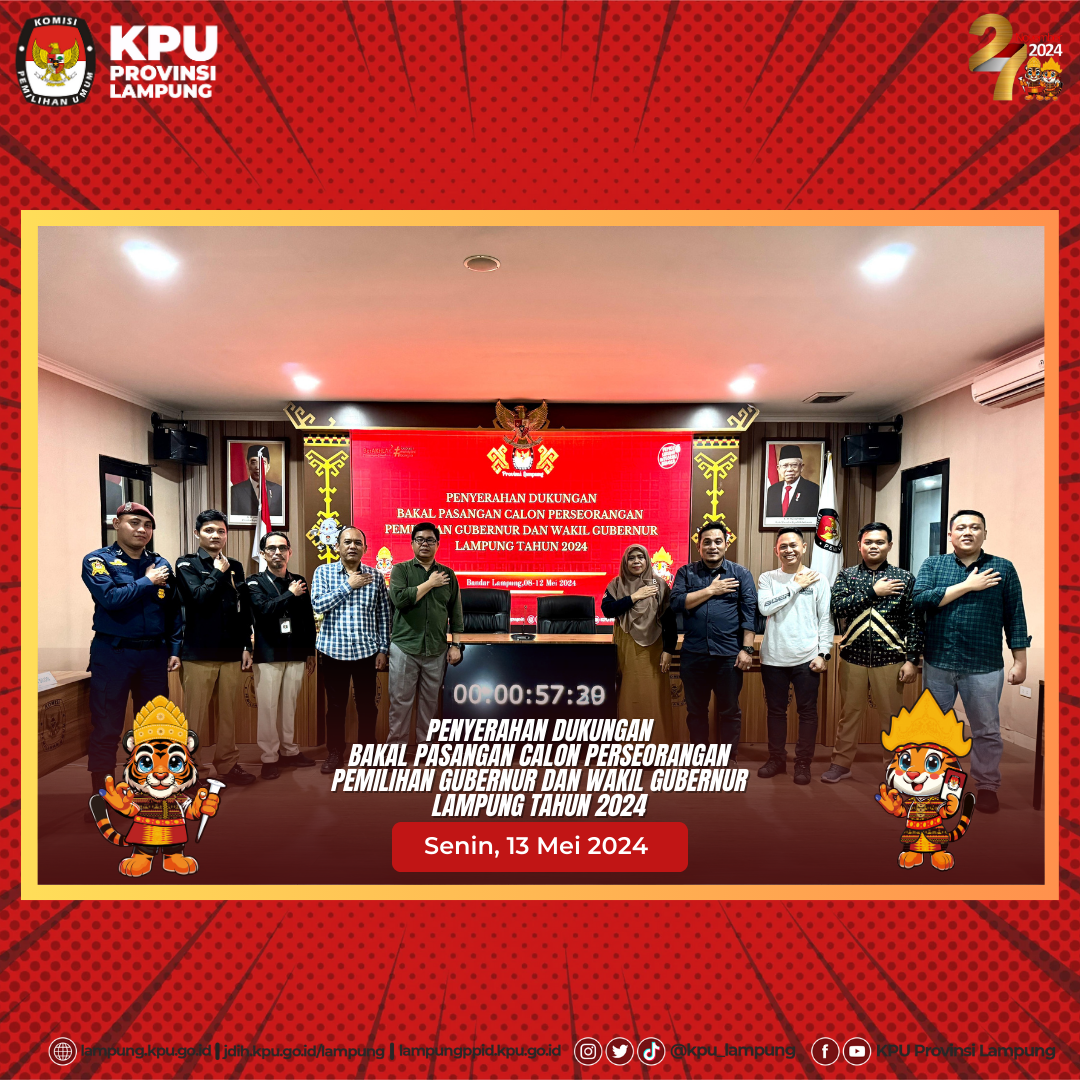 Sesuai dengan Peraturan Komisi Pemilihan Umum Nomor 2 Tahun 2024 tentang Tahapan dan Jadwal Pemilihan Gubernur dan Wakil Gubernur, Bupati dan Wakil Bupati, Serta Walikota dan Wakil Walikota Tahun 2024, bahwa Pemenuhan Persyaratan Dukungan Pasangan Calon Perseorangan dimulai pada tanggal 5 s.d 19 Agustus 2024, selanjutnya sesuai Keputusan KPU Nomor 532 Tahun 2024 penyerahan syarat dukungan bakal pasangan calon dilaksanakan tanggal 8 s.d 12 Mei 2024 sebagaimana pengumuman KPU Provinsi Lampung Nomor 312/PL.02.2-Pu/18/2024 yang dimuat pada laman/website KPU Provinsi Lampung dengan alamat https://lampung.kpu.go.id dan media sosial KPU Provinsi Lampung serta media cetak.