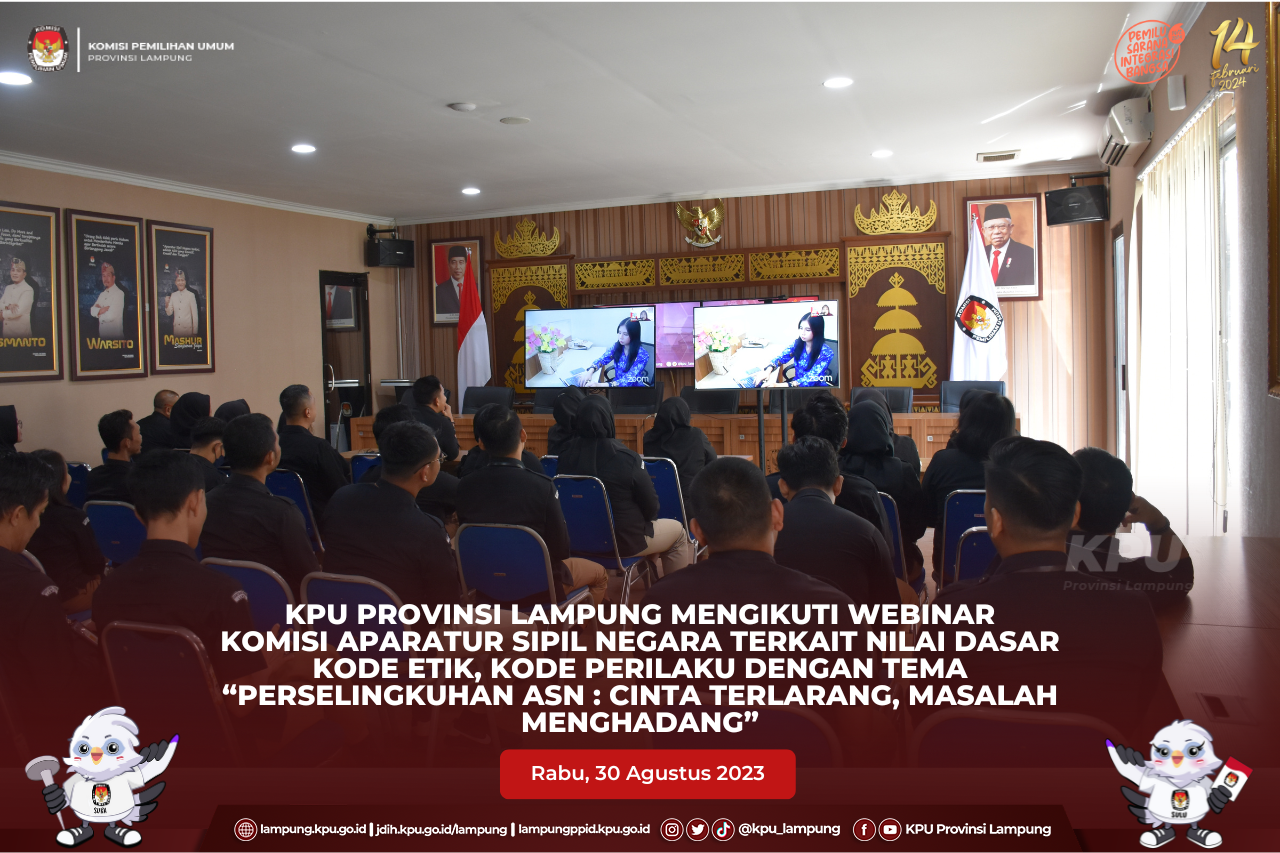 Bandar Lampung, Sekretaris KPU Provinsi Lampung, Mashur Sampurna Jaya bersama dengan jajaran Kabag, Pejabat Fungsional, Kasubbag, dan Staff Pelaksana mengikuti Webinar Komisi Aparatur Sipil Negara Terkait Nilai Dasar Kode Etik, Kode Perilaku dengan Tema “Perselingkuhan ASN : Cinta Terlarang, Masalah Menghadang”, Rabu (30/08/2023). Kegiatan dibuka oleh Ketua KASN, Prof. Agus Pramusinto, MDA dengan menghadirkan dr. Santi Yuliani, M.Sc., Sp.KJ yang merupakan Psikiater/Selebgram dan Penghutan Marpaung dari Asisten KASN sebagai Narasumber.