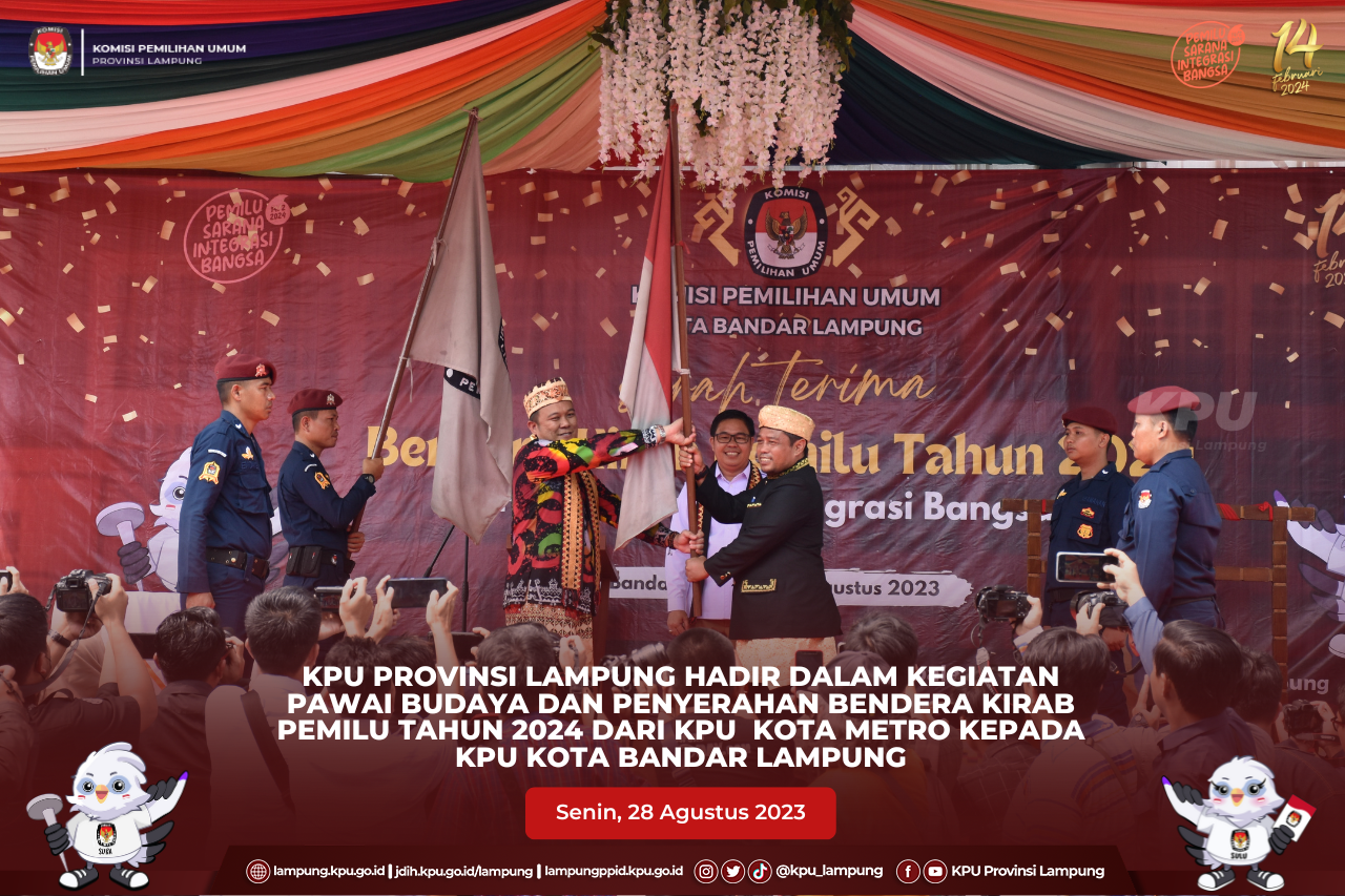 Bandar Lampung, Ketua KPU Provinsi Lampung, Erwan Bustami bersama dengan Anggota, Antoniyus, Titik Sutriningsih, Warsitu beserta jajaran Sekretariat Hadir dalam Kegiatan seremonial serah terima Bendera Kirab Pemilu Tahun 2024 disertai Pawai Budaya dan Kepemiluan oleh KPU Kota Metro kepada KPU Kota Bandar Lampung di Halaman Depan Kantor Pemerintah Kota Bandar Lampung, Senin (28/08/2023). Kegiatan seremonial serah terima Bendera Kirab Pemilu Tahun 2024 Turut Dihadiri oleh Walikota Bandar Lampung, Ketua dan Anggota KPU Kota Bandar Lampung, Ketua dan Anggota Bawaslu Kota Bandar Lampung, Wakil Ketua DPRD Kota Bandar Lampung , Kapolresta Bandar Lampung, Dandim 0410 Kota Bandar Lampung, Kepala Kejaksaan Negeri Bandar Lampung, Ketua Pengadilan Negeri Tanjung Karang, Pimpinan Partai Politik Peserta Pemilu 2024 Kota Bandar Lampung, Kepala OPD Kota Bandar Lampung, Camat dan Lurah se-Kota Bandar Lampung, PPK dan Sekretariat PPK se-Kota Bandar Lampung, PPS dan Sekretariat PPS se-Kota Bandar Lampung, Ketua Organisasi Masyarakat se-Kota Bandar Lampung, berjumlah -+2.646 Orang.