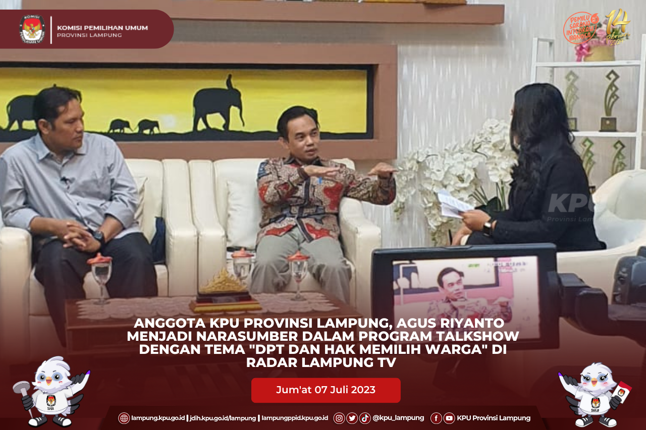 Bandar Lampung, Anggota KPU Provinsi Lampung, Ketua Divisi Data dan Informasi Agus Riyanto menjadi Narasumber dalam Siaran Program Talkshow dalam Tema "Daftar Pemilih Tetap (DPT) dan Hak Memilih Warga". Jum'at, (07/07). Siaran berlangsung di Studio Radar Lampung TV, Bandar Lampung. Turut hadir Narasumber Iwan Satriawan, S.H., M.H. sebagai Pengamat Hukum Pemilu, dan didampingi oleh Vyona Dewi sebagai Host Radar Lampung TV.