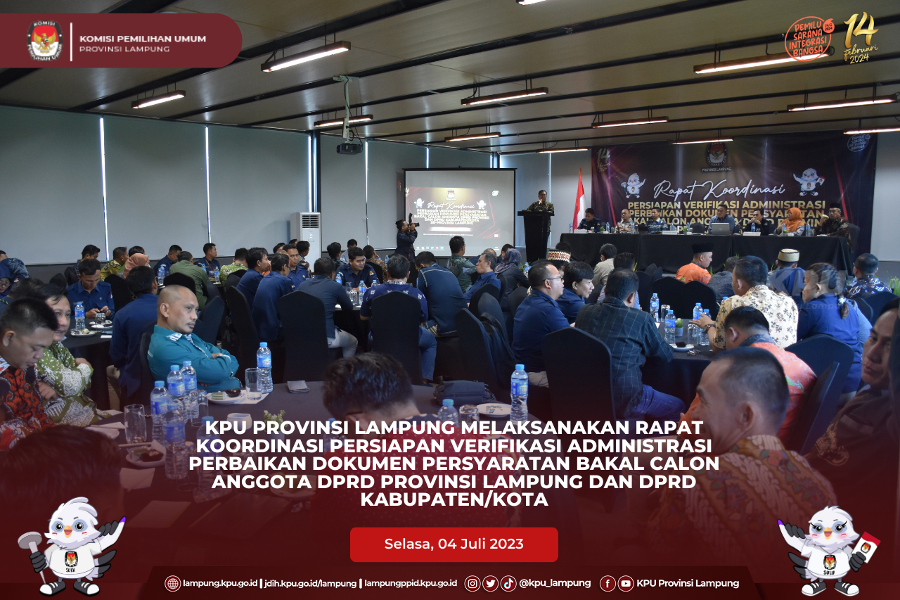 #TemanPemilih,KPU Provinsi Lampung mengadakan Rapat Koordinasi Persiapan Verifikasi Administrasi Perbaikan Dokumen Persyaratan Bakal Calon Anggota DPRD Provinsi dan DPRD Kabupaten/Kota Se-Provinsi Lampung, Selasa (04/7/2023). Kegiatan berlangsung di Ballroom Hotel Kyriad Lampung dan dibuka oleh Ketua KPU Provinsi Lampung,Erwan Bustami. Turut hadir pula Anggota KPU Provinsi Lampung Ismanto, Antoniyus, Ali Sidik, Agus Riyanto, Titik Sutriningsih dan Warsito serta Sekretaris KPU Provinsi Lampung, Mashur Sampurna Jaya, Kabag Tekmas, kabag rendatin, kasubag teknis penyelenggaraan, pejabat fungsional bersama jajaran sekretariat KPU Provinsi Lampung. Dalam kegiatan ini, Erwan Bustami menyampaikan bahwa tahapan ini sudah sampai pada pelaksanaan verifikasi administrasi perbaikan dokumen persyaratan bakal calon anggota DPRD provinsi dan Kabupaten/Kota. Pelaksanaan vermin perbaikan ini mulai dari tanggal 26 juni sampai dengan tanggal 09 juli 2023 yang berlaku mutatis mutandis oleh karena itu penyerahan dokumen perbaikan diserahkan oleh ketua, sekretaris dan bendahara. Agar pelaksanaan penyerahan dokumen vermin perbaikan ini dapat berjalan dengan baik dan lancar dirasa perlu kita menyamakan persepsi pada kegiatan hari ini serta terus meningkatkan komunikasi dan koordinasi kepada partai politik untuk menanyakan bakal calon yang di ajukan menyandang disabilitas dan status pekerjaan yang dilarang, karena kami sudah menghimbau untuk partai politik berlaku jujur dalam mengisi status pekerjaan. Turut hadir pula pada kegiatan ini, Anggota Bawaslu Provinsi Lampung, Suheri, ketua KPU kabupaten/kota, anggota KPU Kabupaten/kota divisi Teknis dan divisi hukum, Kasubag tekmas KPU kabupaten/kota Se-Provinsi Lampung serta Operator SILON. #KPUMelayani #KPULampung #PemiluSerentak2024