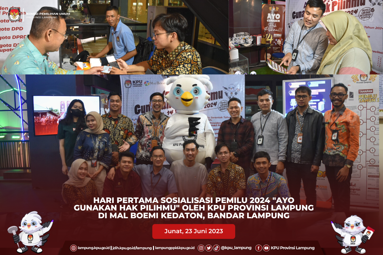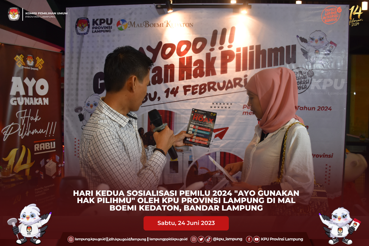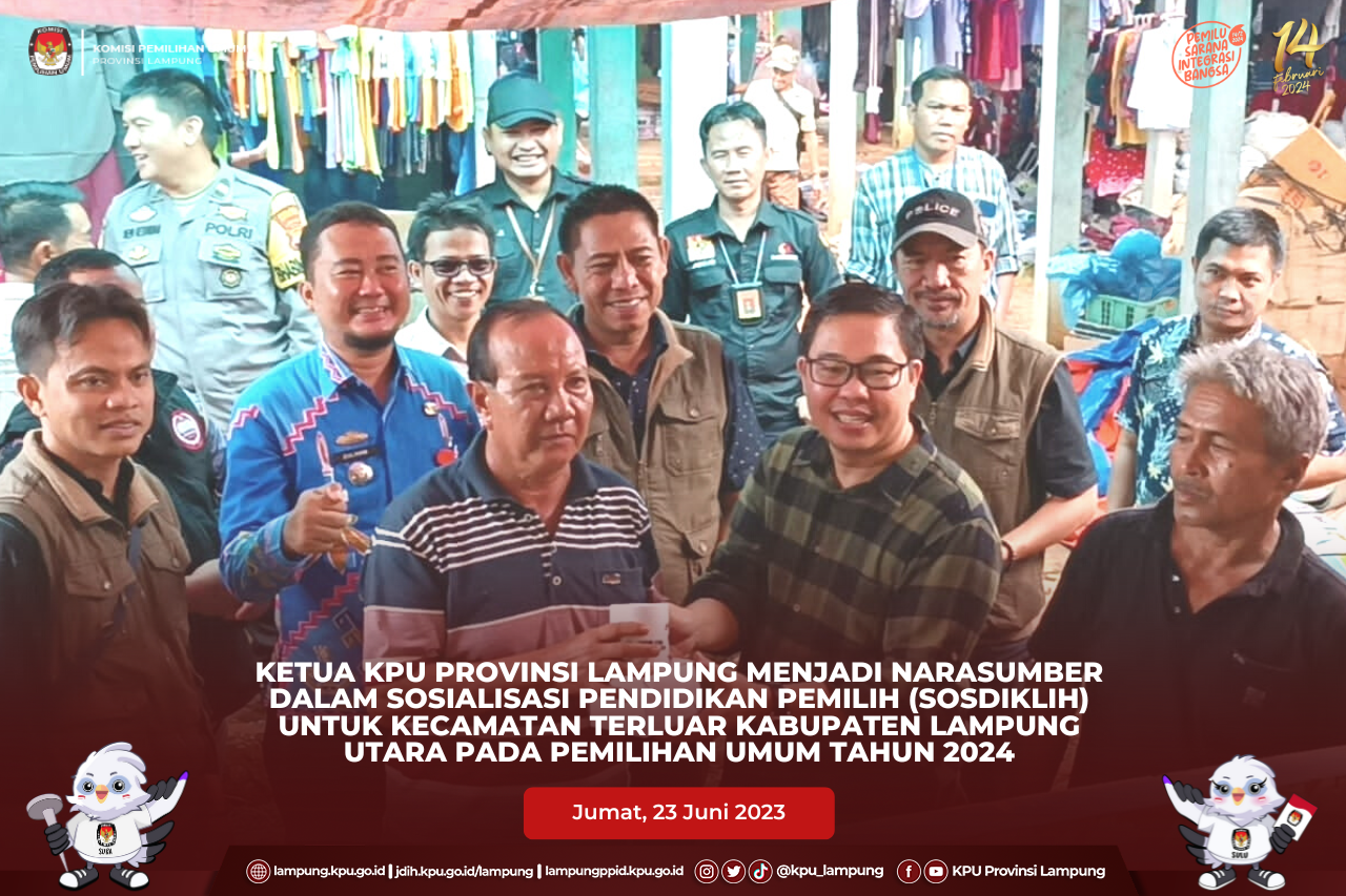 Bandar Lampung, Ketua KPU Provinsi Lampung, Erwan Bustami menjadi Narasumber dalam kegiatan Sosialisasi Pendidikan Pemilih (Sosdiklih) untuk Kecamatan Terluar Kabupaten Lampung Utara dan Penguatan Kelembagaan Badan AD Hoc KPU Kabupaten Lampung Utara pada Pemilihan Umum Tahun 2024, Jum'at (23/06/2023). Kegiatan berlangsung di desa Gedung Negara kecamatan Hulu Sungkai dilanjutkan dengan sosialisasi langsung Grebek Pasar di Pasar Jumat. Turut hadir dalam kegiatan Ketua dan Anggota KPU Lampung Utara, Camat Hulu Sungkai beserta jajaran dan dari unsur kepolisian. Dalam kesempatan itu, Ketua KPU Provinsi, Erwan Boestami mengatakan, acara gerebek pasar ini bertujuan untuk mensosialisasikan tahapan pemilu, waktu pemilu dan apa saja yang akan dipilih masyarakat pada saat hari pemilihan yang akan berlangsung pada 14 Februari tahun 2024 mendatang. ” Bapak-bapak, Ibu-ibu mari kita gunakan hak pilih kita untuk masa depan bangsa. Jangan sampai salah pilih, lima menit di bilik suara akan menentukan nasib bangsa lima tahun ke depan. Kita memilih Presiden dan Wakil Presiden, DPD, DPR-RI, DPRD Provinsi dan DPRD Kabupaten/Kota,” serunya. Pemilu, lanjut dia, merupakan hajad bangsa lima tahunan sebagai sarana kedaulatan rakyat dalam kehidupan berdemokrasi di negara ini. Terdapat lima surat suara yang akan kita dapati saat di TPS nanti. ” nanti bapak-bapak dan ibu-ibu akan menerima lima surat suara yakni list warna abu-abu untuk Presiden, merah untuk DPD, kuning untuk DPR-RI, biru untuk DPRD Provinsi dan hijau untuk DPRD kabupaten kota,” terangnya seraya kembali menyerukan agar masyarakat menggunakan hak pilihnya. #KPUMelayani #KPULampung #PemiluSerentak2024