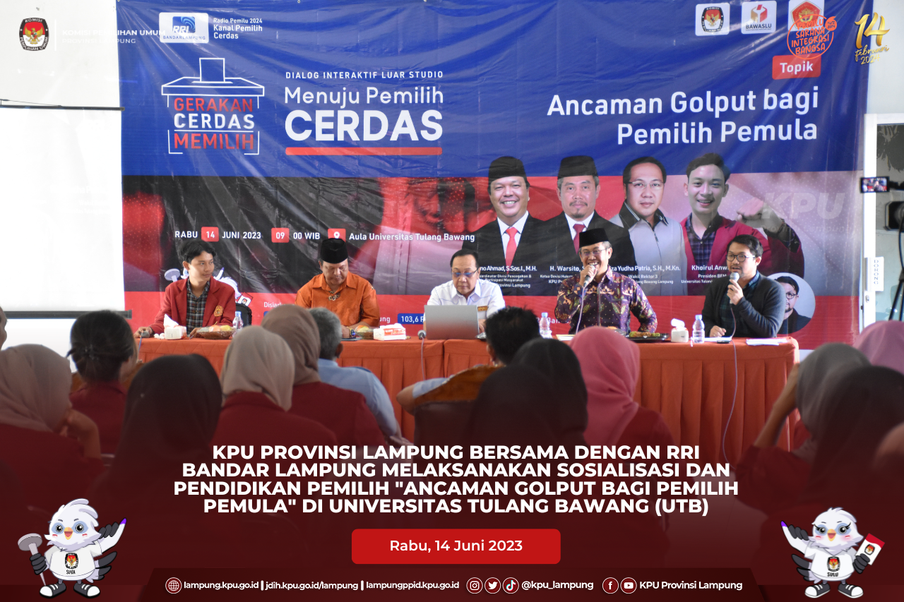 Bandar Lampung, KPU Provinsi Lampung bersama dengan RRI Bandar Lampung melaksanakan sosialisasi dan pendidikan pemilih "Ancaman Golput bagi Pemilih Pemula" di Universitas Tulang Bawang (UTB), Rabu (14/06/2023). Kegiatan yang diikuti oleh Mahasiswa UTB tersebut menghadirkan narasumber Anggota KPU Provinsi Lampung, Warsito, Anggota Bawaslu Provinsi Lampung, Karno Ahmad, Wakil Rektor III UTB, Riza Yudha Patria dan Presiden BEM UTB, Khoirul Anwar.