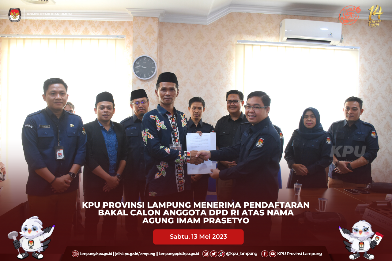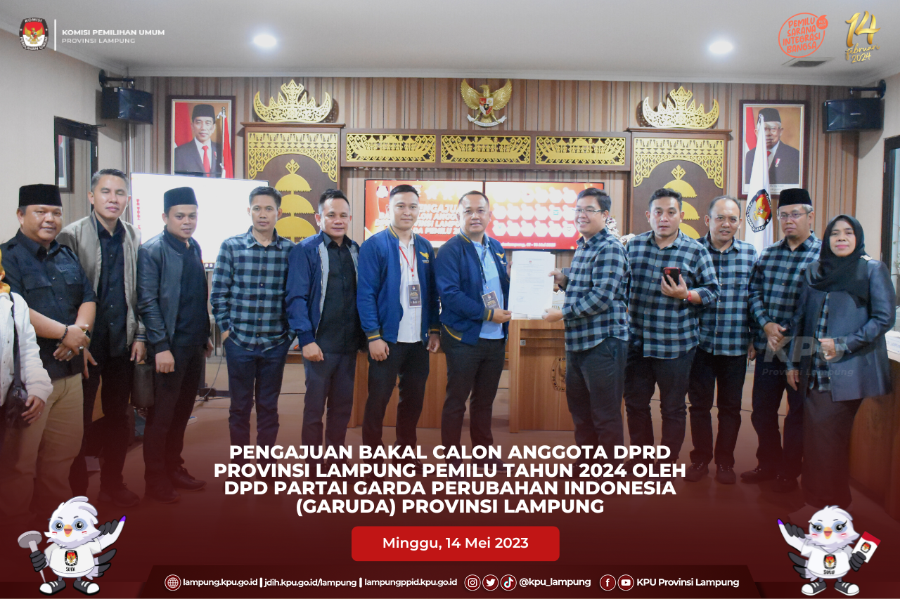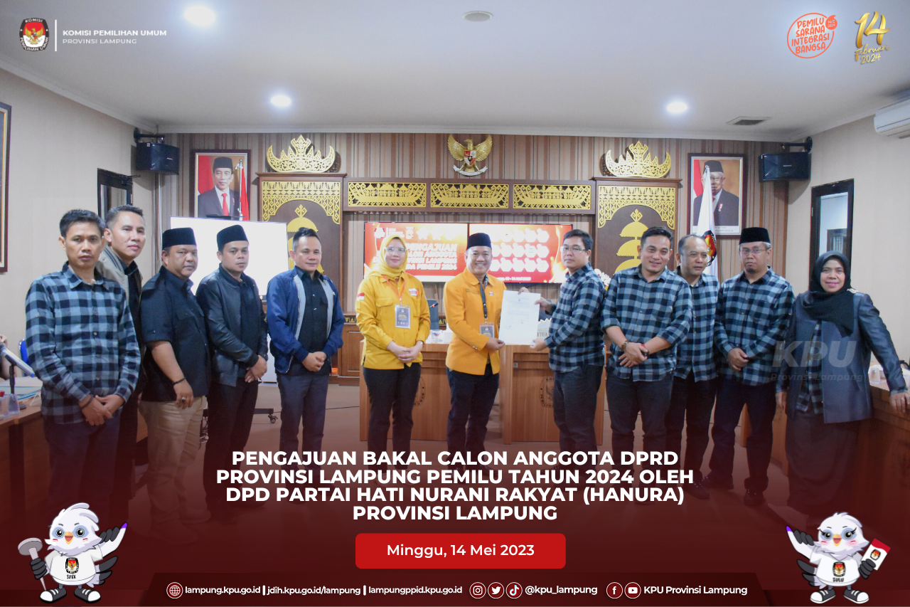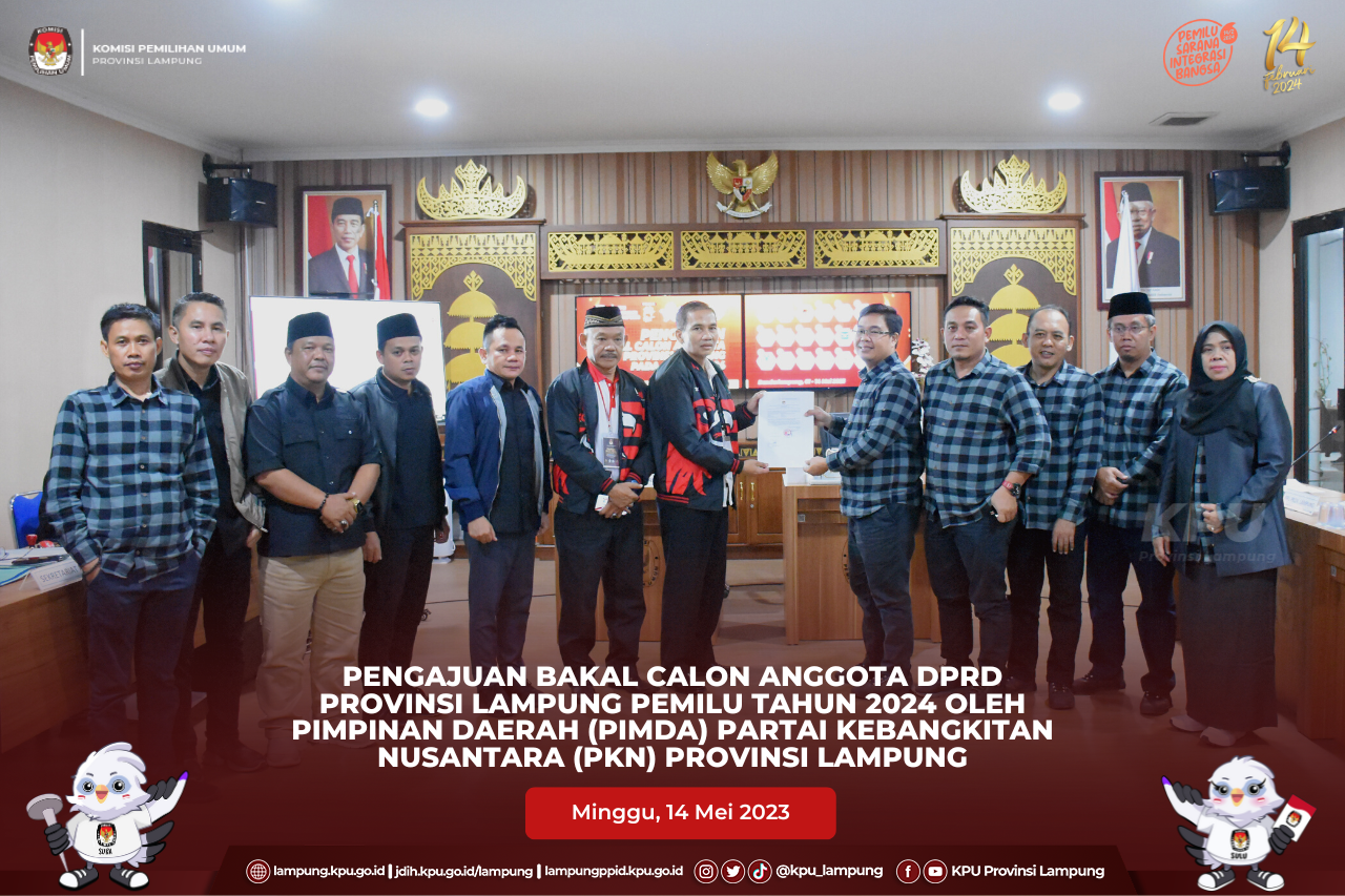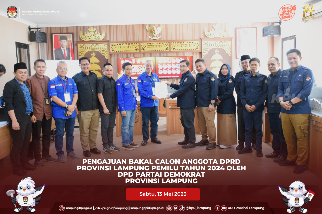 Delegasi partai diterima oleh Ketua KPU Provinsi Lampung, Erwan Bustami, Anggota KPU Provinsi Lampung, Ismanto, Antoniyus, Ali Sidik, Warsito, Titik Sutriningsih bersama Sekretaris KPU Provinsi Lampung, Mashur Sampurna Jaya dan disaksikan oleh Ketua Bawaslu Provinsi Lampung Iskardo P Pagar beserta Anggota Bawaslu Provinsi Lampung, Suheri, Teguh, Hermansyah, Imam Bukhori dan Karno, di Aula KPU Provinsi Lampung.