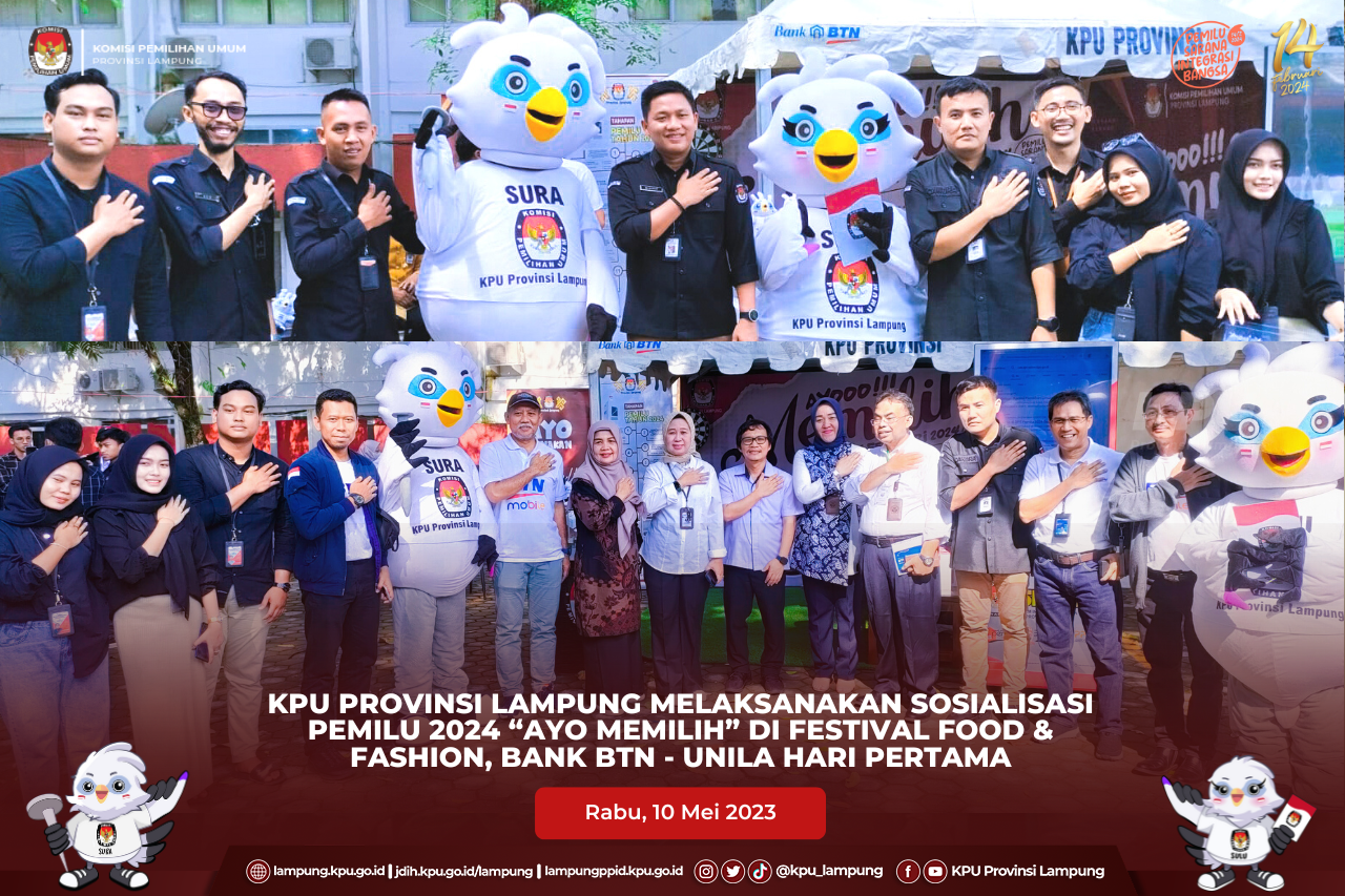 Bandar Lampung, KPU Provinsi Lampung kembali memasifkan sosialisasi Pemilu 2024, kali ini KPU Provinsi Lampung berpartisipasi dengan membuka stand Pemilu pada acara Festival Food & Fashion Bank BTN – Unila yang dipusatkan di lapangan belakang Rektorat Universitas Lampung, Rabu (10/05). Pada kesempatan tersebut, KPU Lampung mengajak para pengunjung untuk mengecek secara online apakah dirinya sudah terdaftar sebagai pemilih atau belum melalui website cekdptonline.kpu.go.id. Selain itu KPU Provinsi Lampung juga mensosialisasikan tahapan pemilu dan meberikan pendidikan pemilih (politik) kepada masyarakat. KPU Provinsi Lampung juga menyediakan game dan beragam doorprize.