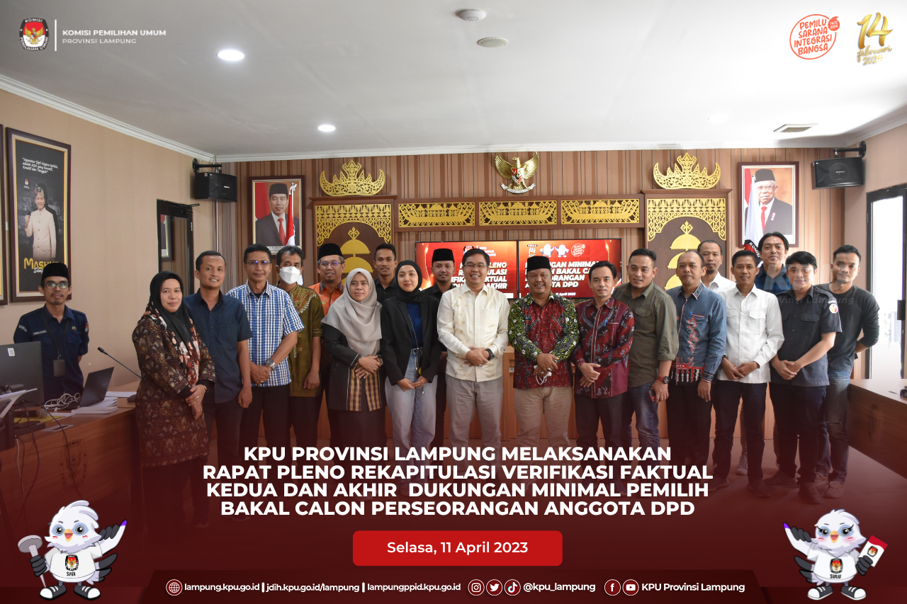 Bandar Lampung, KPU Provinsi Lampung melaksanakan Rapat Pleno Rekapitulasi Verifikasi Faktual Kedua Dukungan Minimal Pemilih Bakal Calon Perseorangan Anggota DPD yang diikuti oleh 4 LO bakal calon persorangan dan dilanjutkan dengan Rapat Pleno Rekapitulasi Akhir Dukungan Minimal Pemilih Bakal Calon Perseorangan Anggota DPD yang diikuti oleh 18 bakal calon perseorangan, Selasa (11/04). Kegiatan yang dilaksanakan di Aula KPU Provinsi Lampung ini dihadiri oleh Ketua KPU Provinsi Lampung, Erwan Bustami, Anggota, Ismanto, Titik Sutriningsih, Ali Sidik, Warsito, Agus Riyanto, Antoniyus serta Anggota Bawaslu Provinsi Lampung, Karno Ahmad Satarya.