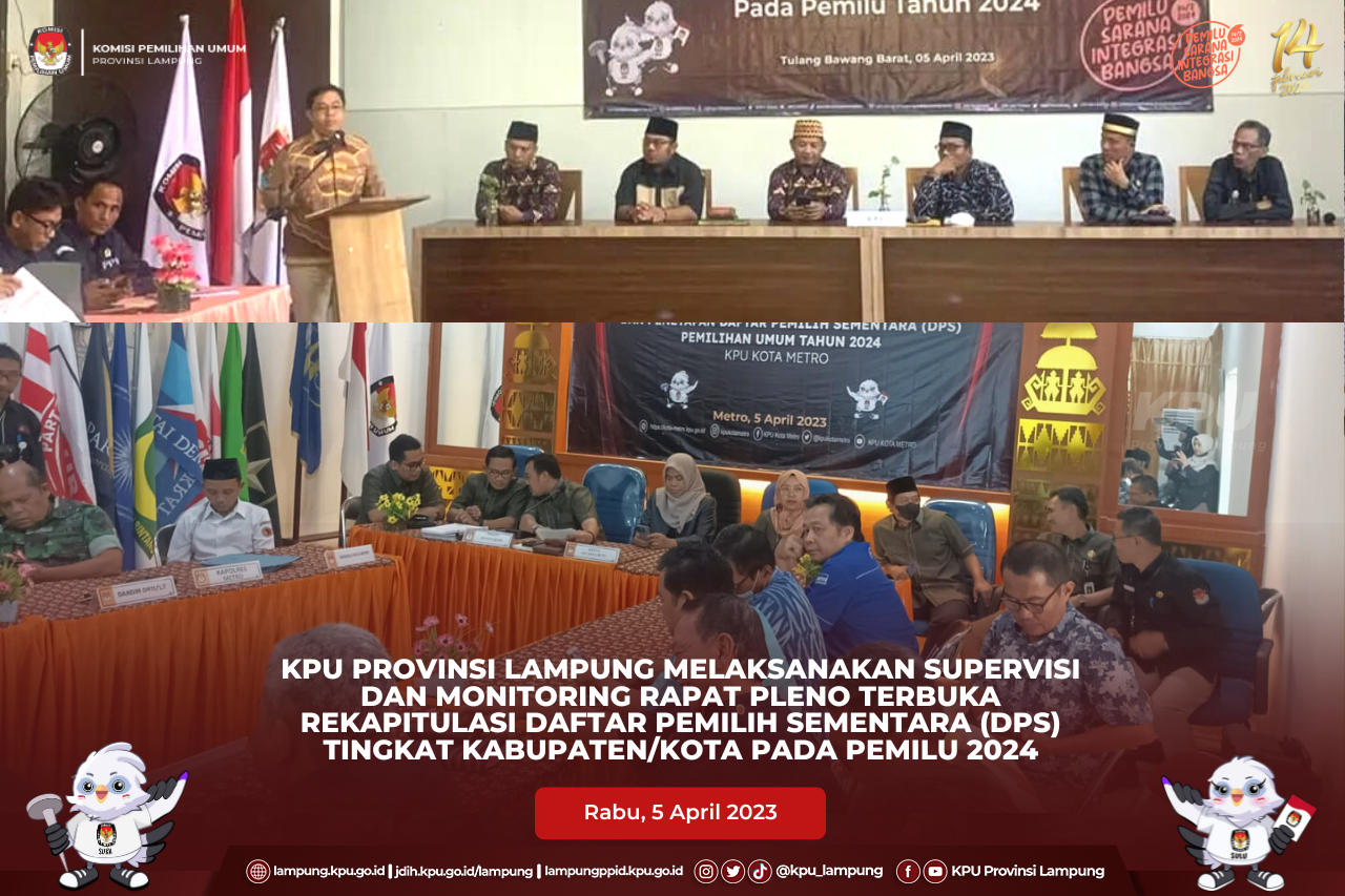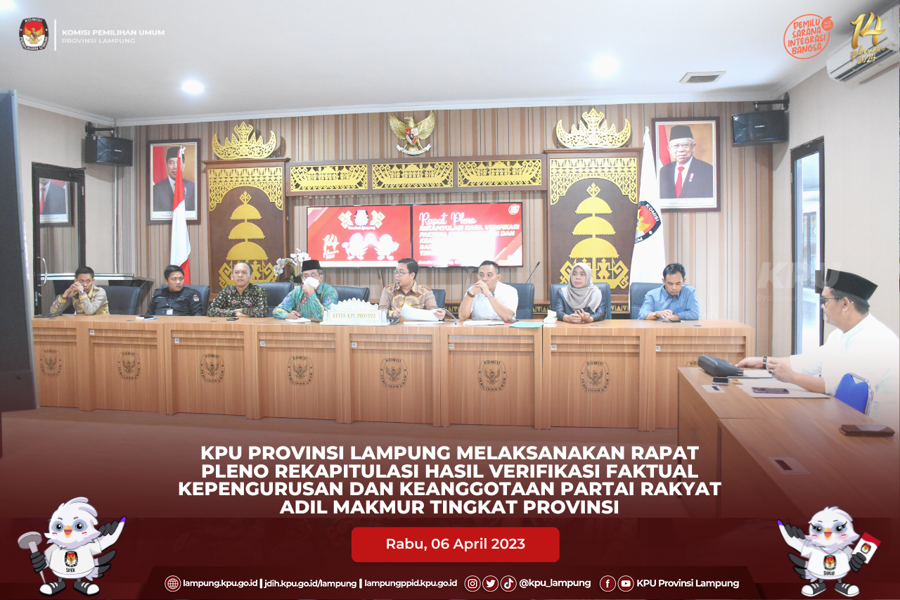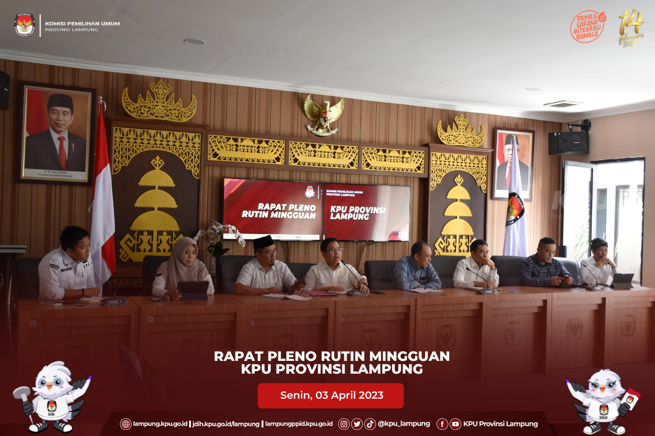 Bandar Lampung, KPU Provinsi Lampung melaksanakan Rapat Pleno Rutin Mingguan di Aula KPU Provinsi Lampung, Senin (03/04). Kegiatan Rapat dibuka oleh Ketua KPU Provinsi Lampung, Erwan Bustami dan dihadiri oleh Anggota KPU Provinsi Lampung, Ali Sidik, Titik Sutriningsih, Agus Riyanto, Warsito, Antoniyus, Ismanto, Sekretaris, Mashur Sampurna Jaya, beserta Para Kabag, Pejabat Fungsional dan Para Kasubag. Dalam Rapat Pleno dibahas mengenai Proses Verifikasi Faktual terhadap Partai PRIMA di Provinsi dan Kabupaten/Kota sebagai tindaklanjut dari putusan Bawaslu terhadap partai Prima, Proses Rekapitulasi Data Pemilih Hasil Pemutakhiran di tingkat Desa/Kelurahan, hasil rakor Bersama KPU RI terkait jumlah TPS Khusus, penyampaian informasi hasil Rakor terkait penyelesaian sengketa, proses penyelesaian pembayaran honorarium badan adhoc serta pembahasan lainnya.