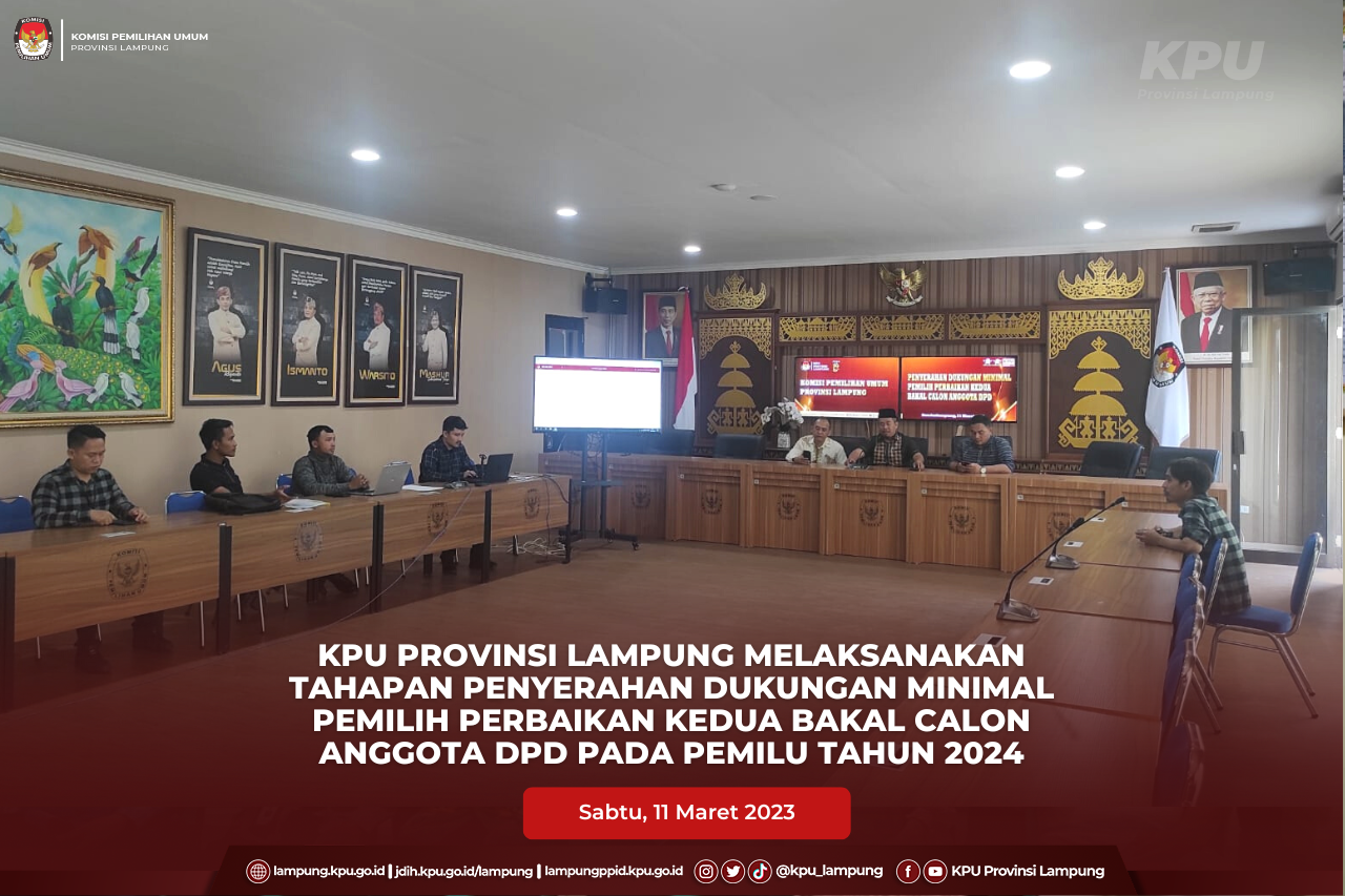 Bandar Lampung, KPU Provinsi Lampung melaksanakan Tahapan Penyerahan Dukungan Minimal Pemilih Perbaikan Kedua Bakal Calon Anggota DPD pada Pemilu Tahun 2024, Sabtu (11/03). Kegiatan yang berlangsung di Aula KPU Provinsi Lampung ini diikuti oleh Bakal/LO bakal calon DPD . Kegiatan dibuka oleh ketua KPU Provinsi Lampung Erwan Bustami dan dihadiri oleh Ismanto , Ali Sidik, Antoniyus dan Warsito Serta Mashur Sampurna Jaya selaku Sekretaris KPU provinsi Lampung , Kabag Tekmas, Kasubag Teknis Penyelenggaraan Pemilu dan Staf Teknis Penyelenggaraan Pemilu.