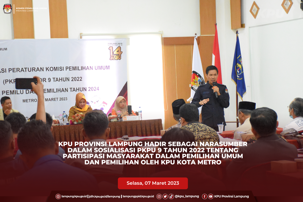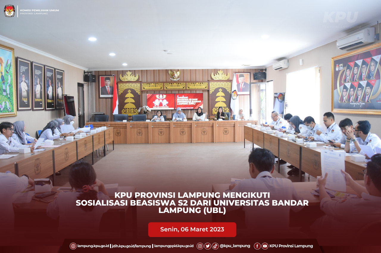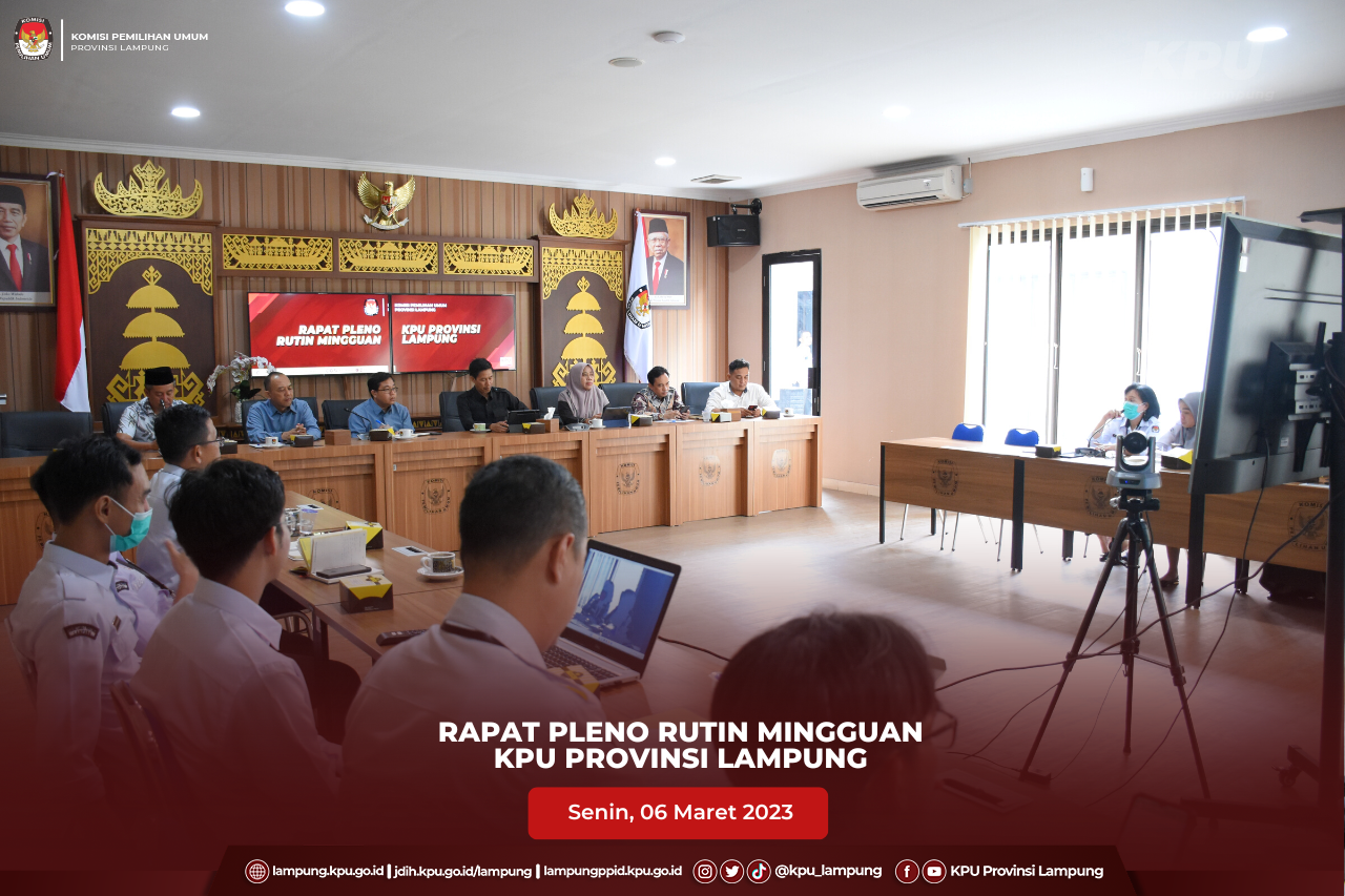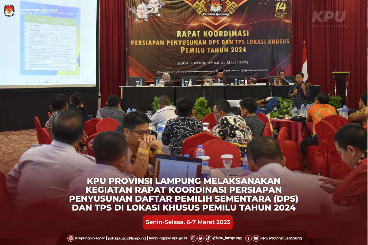 Bandar Lampung, KPU Provinsi Lampung melaksanakan kegiatan Rapat Koordinasi Persiapan Penyusunan Daftar Pemilih Sementara (DPS) dan TPS di lokasi khusus Pemilu Tahun 2024, Senin s.d Selasa (06-07/03). Kegiatan tersebut dibuka oleh Ketua KPU Provinsi Lampung, Erwan Bustami didampingi oleh Anggota Agus Riyanto, Ismanto, Ali Sidik, Titik Sutriningsih dan Warsito. Kegiatan diikuti oleh peserta dari KPU Provinsi Lampung dan peserta dari KPU Kabupaten Kota yaitu Ketua Divisi Data dan Informasi, Kasubbag Perencanaan Data dan Informasi, Admin/Operator Sidalih KPU Kabupaten Kota. Hadir sebagai Narasumber dalam kegiatan Kadisdukcapil Provinsi Lampung, Achmad Saefulloh yang menyampaikan materi terkait Dukungan Disdukcapil Dalam Tahapan Penyusunan Daftar Pemilih Pemilu 2024, Anggota Bawaslu Provinsi Lampung, Karno Ahmad Satarya yang mneyampaikan materi terkait Peran Strategis Bawaslu Lampung Dalam Penguatan Kualitas Daftar Pemilih Pemilu 2024 dan dari Akdademisi FISIP Unila, Robi Cahyadi Kurniawan yang menyampaikan materi terkait Kontribusi Perguruan Tinggi Menyambut Pemilu 2024. Kegiatan dilanjutkan dengan penyampaian arahan oleh Anggota KPU Provinsi Lampung dan pemaparan materi terkait Persiapan Penyusunan Daftar Pemilih Sementara (DPS) dan TPS di lokasi khusus Pemilu Tahun 2024 oleh Ketua Divisi Data dan Informasi KPU Provinsi Lampung, Agus Riyanto serta penyampaian laporan perkembangan penyusunan daftar pemilih di Lokasi Khusus. #KPUMelayani #KPULampung #PemiluSerentak2024